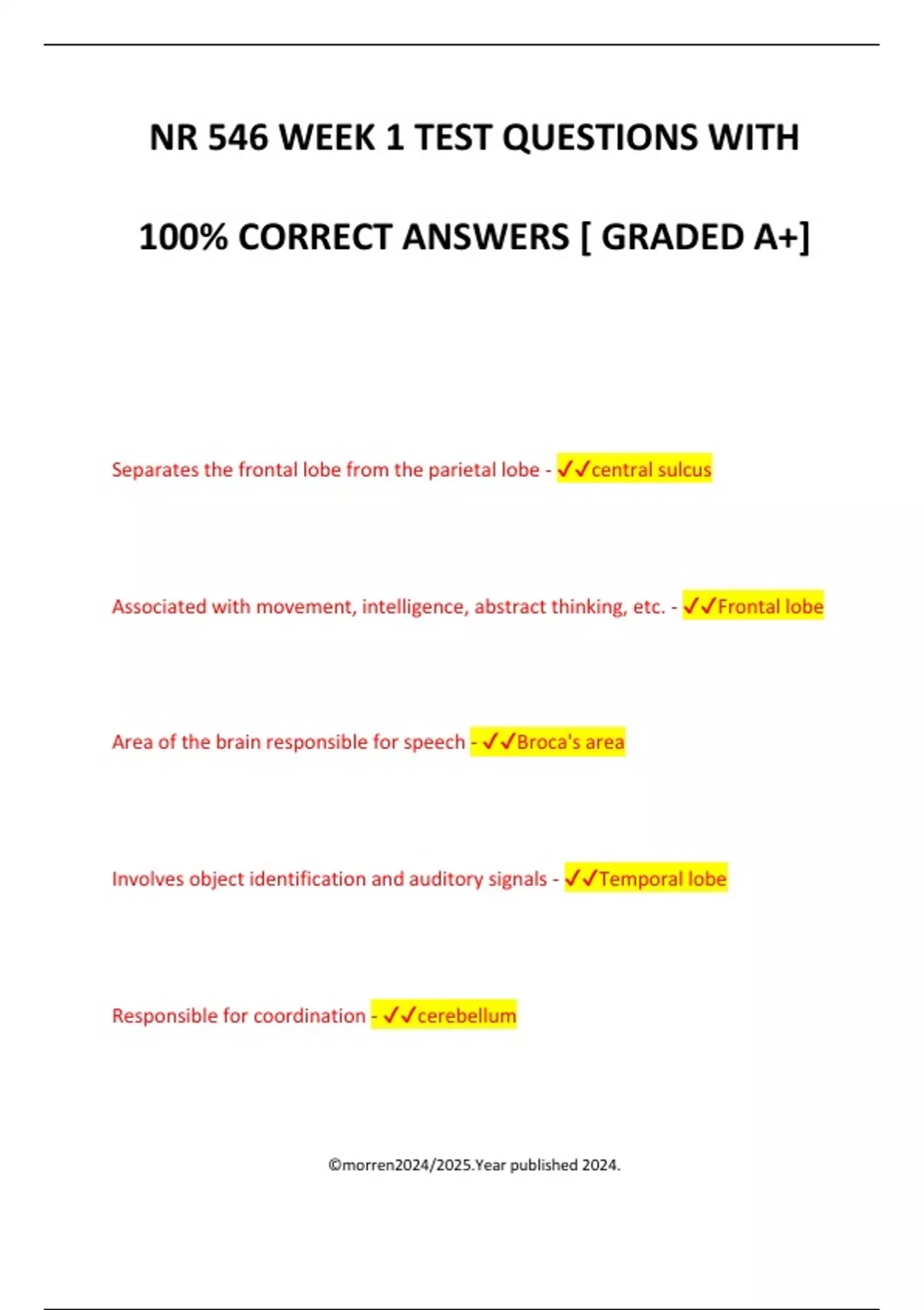 NR 546 WEEK 1 TEST QUESTIONS WITH 100% CORRECT ANSWERS [ GRADED A+] Separates the frontal lobe from the parietal lobe - central sulcus Associated with movement, intelligence, abstract thinking, etc. - Frontal lobe Area of the brain responsible for speech - Broca's area Involves object identification and auditory signals - Temporal lobe Responsible for coordination - cerebellum ©morren2024/2025.Year published 2024. Area of the brain responsible for speech comprehension - Wernickes area Primary visual area - occipital lobe Keeps us alert to what is going on around us - parietal lobe Responsible for pain, heat, and other sensations - sensory cortex responsible for movement - motor cortex involved in both memory and anxiety - hippocampus involved in the reward process - nucleus accumbens involved in sensory organ and motor command processing - thalamus ©morren2024/2025.Year published 2024.