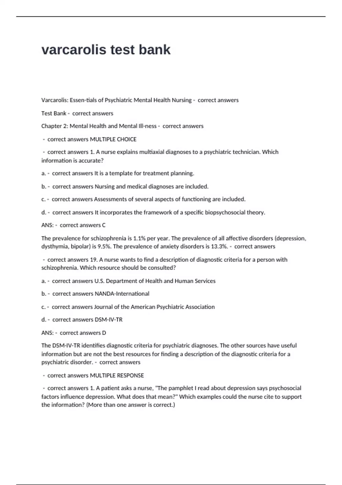 Varcarolis: Essen-tials of Psychiatric Mental Health Nursing - correct answers
