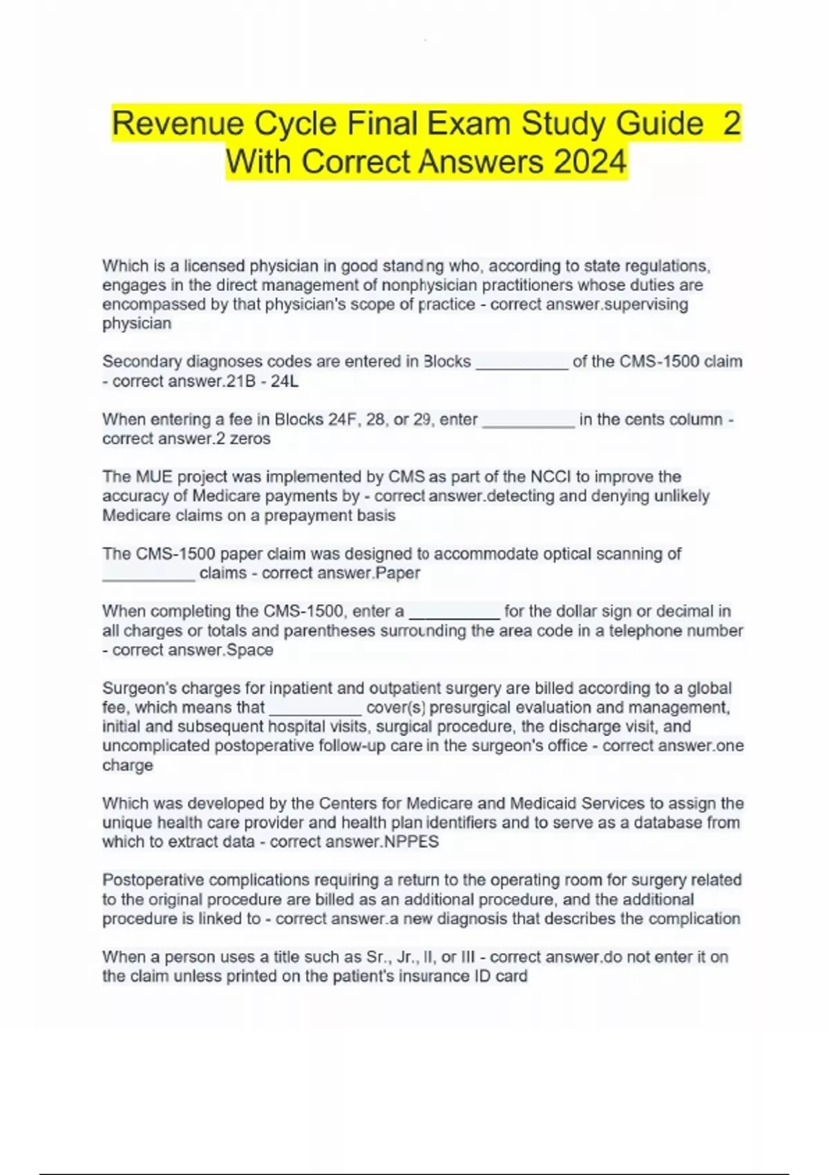 Revenue Cycle Final Exam Study Guide 2 With Correct Answers 2024