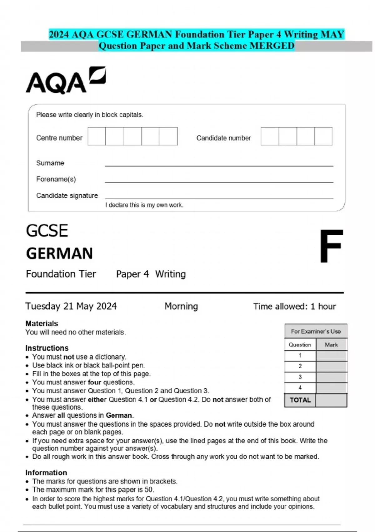 2024 AQA GCSE GERMAN Foundation Tier Paper 4 Writing MAY Question Paper and Mark Scheme MERGED