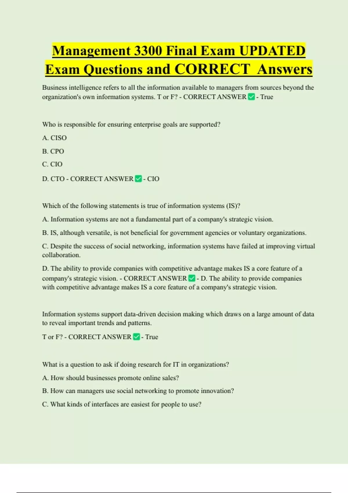 Management 3300 Final Exam UPDATED Exam Questions and CORRECT Answers Business intelligence refers to all the information available to managers from sources beyond the organization's own information systems. T or F? - CORRECT ANSWER - True Who is responsible for ensuring enterprise goals are supported? A. CISO B. CPO C. CIO D. CTO - CORRECT ANSWER - CIO