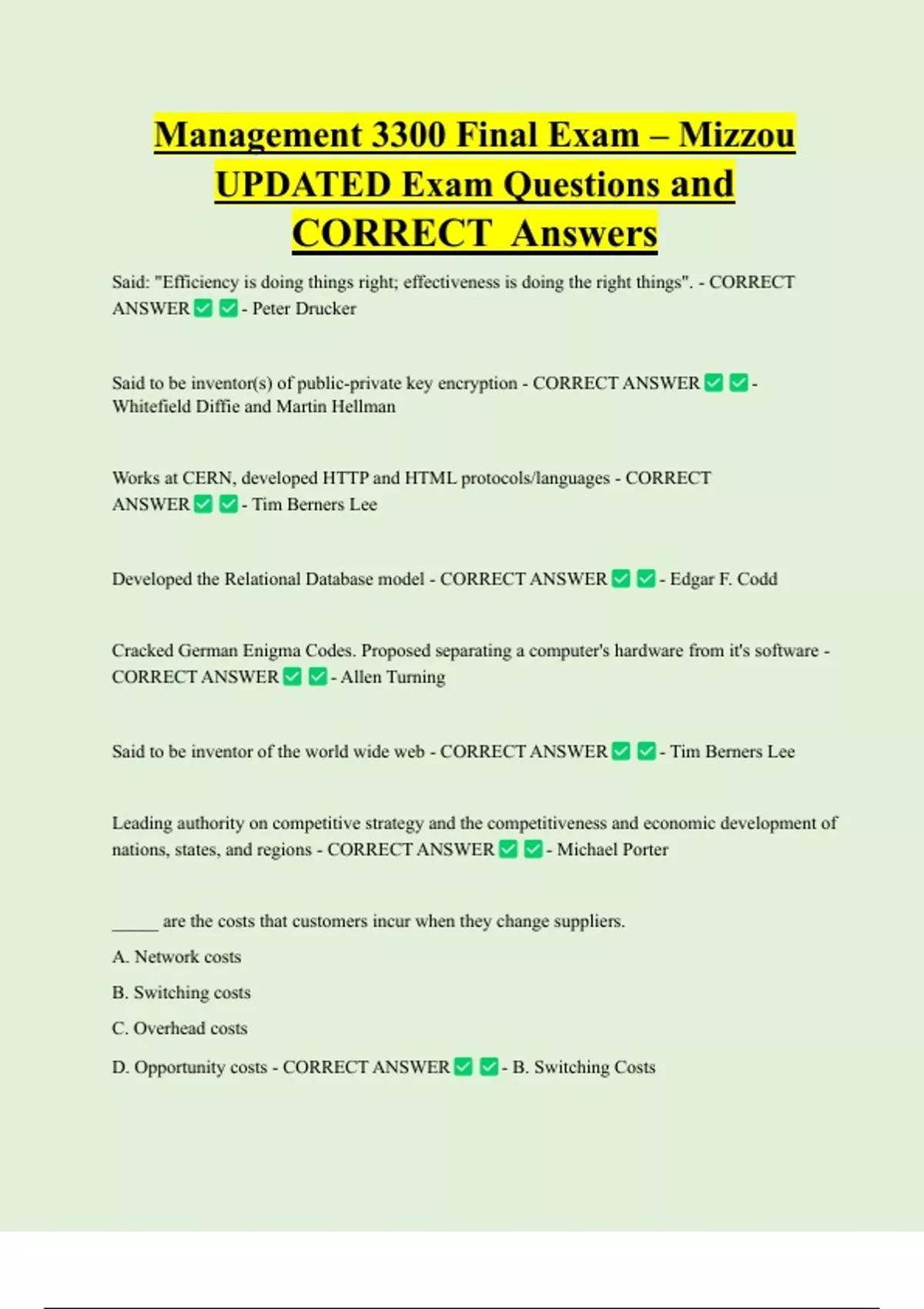 Management 3300 Final Exam – Mizzou UPDATED Exam Questions and CORRECT Answers Said: "Efficiency is doing things right; effectiveness is doing the right things". - CORRECT ANSWER - Peter Drucker Said to be inventor(s) of public-private key encryption - CORRECT ANSWER - Whitefield Diffie and Martin Hellman