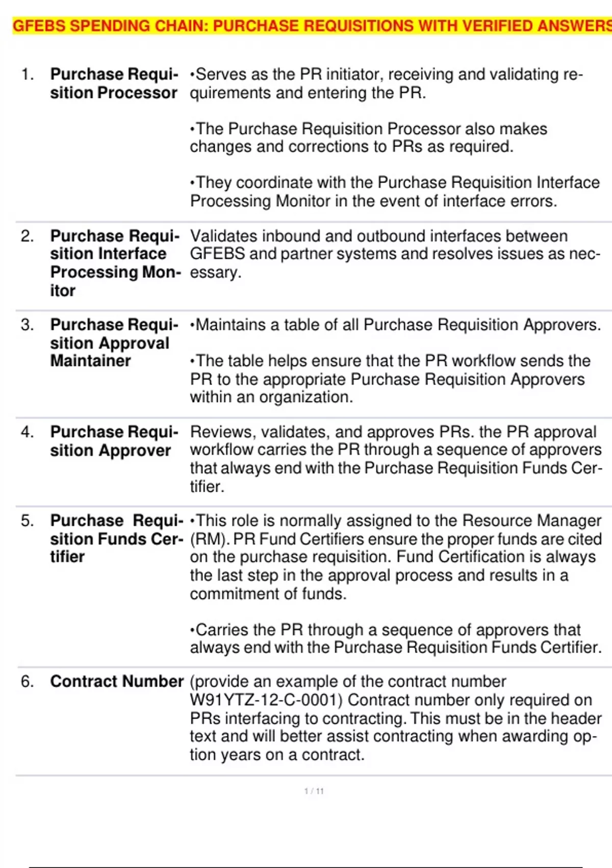 , GFEBS SPENDING CHAIN: PURCHASE REQUISITIONS WITH VERIFIED ANSWERS