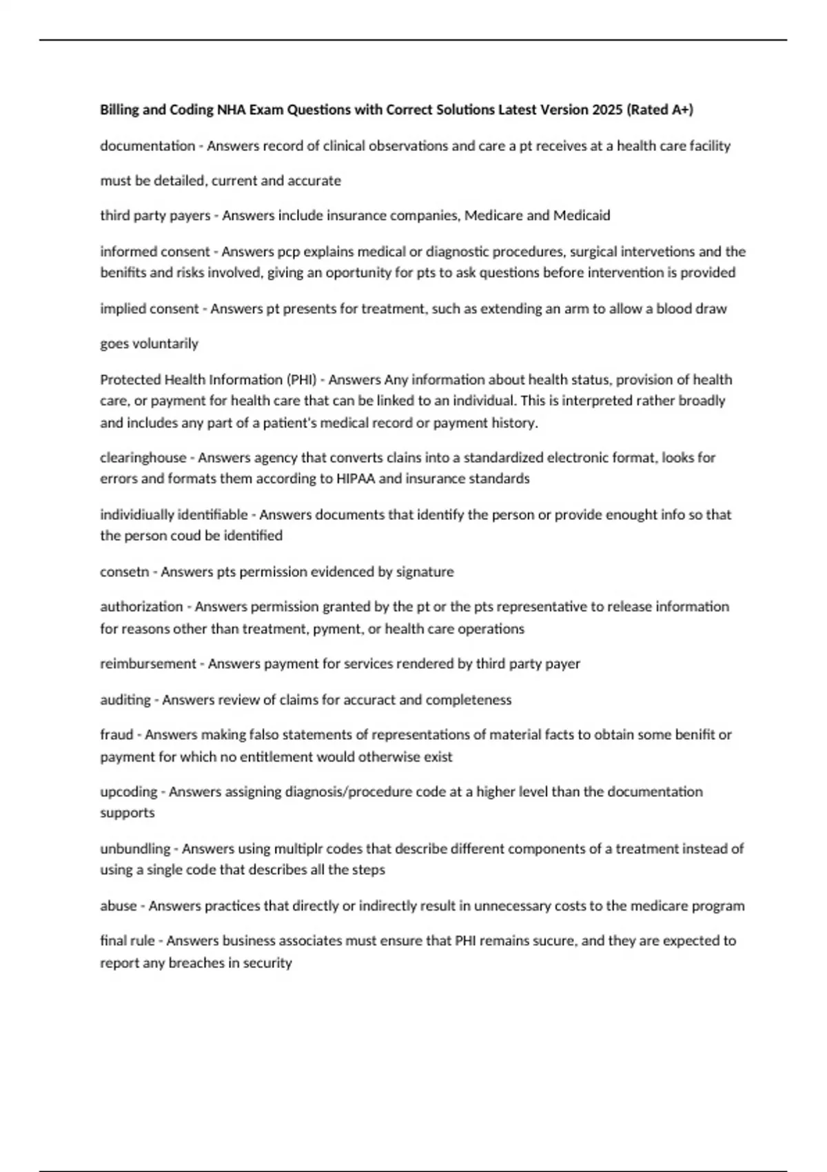 Billing and Coding NHA Exam Questions with Correct Solutions Latest Version 2025 (Rated A+) documentation - Answers record of clinical observations and care a pt receives at a health care facility must be detailed, current and accurate third party payers - Answers include insurance companies, Medicare and Medicaid informed consent - Answers pcp explains medical or diagnostic procedures, surgical intervetions and the benifits and risks involved, giving an oportunity for pts to ask questions before intervention is provided implied consent - Answers pt presents for treatment, such as extending an arm to allow a blood draw goes voluntarily Protected Health Information (PHI) - Answers Any information about health status, provision of health care, or payment for health care that can be linked to an individual. This is interpreted rather broadly and includes any part of a patient's medical record or payment history. clearinghouse - Answers agency that converts clains into a standardized electronic format, looks for errors and formats them according to HIPAA and insurance standards individiually identifiable - Answers documents that identify the person or provide enought info so that the person coud be identified consetn - Answers pts permission evidenced by signature authorization - Answers permission granted by the pt or the pts representative to release information for reasons other than treatment, pyment, or health care operations reimbursement - Answers payment for services rendered by third party payer auditing - Answers review of claims for accuract and completeness fraud - Answers making falso statements of representations of material facts to obtain some benifit or payment for which no entitlement would otherwise exist upcoding - Answers assigning diagnosis/procedure code at a higher level than the documentation supports unbundling - Answers using multiplr codes that describe different components of a treatment instead of using a single code that describes all the steps abuse - Answers practices that directly or indirectly result in unnecessary costs to the medicare program final rule - Answers business associates must ensure that PHI remains sucure, and they are expected to report any breaches in security stark law - Answers pcps are not allowed to refer pts to a pcp with whom they have a financial relationship with CMS - Answers has oversight responsibilities to stark law false claims act - Answers protects the government from being overcharges for services provider or sold, or substandard goos or services Office of the Inspector General (OIG) - Answers has the authority to exclude individuals and entities who have engages in fraud and abuse from participating in Medicare, Medicaid, and other federal helath care programs claim - Answers complete recors of the servics provided by the health care professional, along with appropriate insurance info transmitting claims - Answers sending required info to third party payers for reimbursement filing claims for medicare - Answers claims must be recieved within 1 calander year of the claim's date of service coordination of benifits - Answers determines which insurance plan is primary and which is secondary conditional payment - Answers medicare payment that is recovered after primary insurance pays