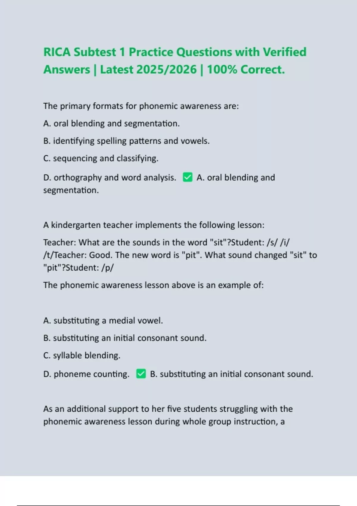 The primary formats for phonemic awareness are: A. oral blending and segmentation. B. identifying spelling patterns and vowels. C. sequencing and classifying. D. orthography and word analysis. A. oral blending and segmentation. A kindergarten teacher implements the following lesson: Teacher: What are the sounds in the word "sit"?Student: /s/ /i/ /t/Teacher: Good. The new word is "pit". What sound changed "sit" to "pit"?Student: /p/ The phonemic awareness lesson above is an example of: A. substituting a medial vowel. B. substituting an initial consonant sound. C. syllable blending. D. phoneme counting. B. substituting an initial consonant sound. As an additional support to her five students struggling with the phonemic awareness lesson during whole group instruction, a kindergarten teacher uses Elkonin boxes with colored tiles. As the teacher says a word, the student moves a tile in a box for each sound they hear in the target word. The teacher calls on each student to tell her the sounds they hear in the word while touching the colored tiles. This strategy should enhance understanding of identifying sounds because: A. it uses an auditory technique that allows the student to hear the sounds louder during instruction. B. it uses a pre-teaching technique that prepares the student to identify sounds orally. C. it enhances the lesson by making it more fun for students, using colors and grids. D. it uses a kinesthetic technique that allows the student to use a hands-on approach for identifying sounds in a word. D. it uses a kinesthetic technique that allows the student to use a hands-on approach for identifying sounds in a word.