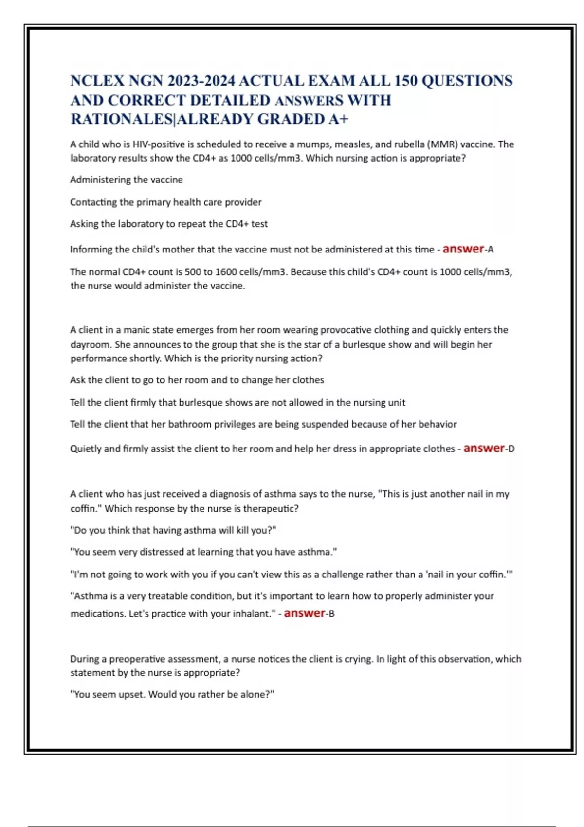 NCLEX NGN ACTUAL EXAM ALL 150 QUESTIONS AND CORRECT DETAILED ANSWERS WITH RATIONALES|ALREADY GRADED A+ NCLEX NGN ACTUAL EXAM ALL 150 QUESTIONS AND CORRECT DETAILED ANSWERS WITH RATIONALES|ALREADY GRADED A+