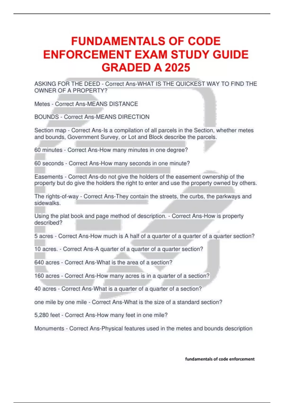 ASKING FOR THE DEED - Correct Ans-WHAT IS THE QUICKEST WAY TO FIND THE OWNER OF A PROPERTY? Metes - Correct Ans-MEANS DISTANCE BOUNDS - Correct Ans-MEANS DIRECTION Section map - Correct Ans-Is a compilation of all parcels in the Section, whether metes and bounds, Government Survey, or Lot and Block describe the parcels. 60 minutes - Correct Ans-How many minutes in one degree? 60 seconds - Correct Ans-How many seconds in one minute? Easements - Correct Ans-do not give the holders of the easement ownership of the property but do give the holders the right to enter and use the property owned by others. The rights-of-way - Correct Ans-They contain the streets, the curbs, the parkways and sidewalks. Using the plat book and page method of description. - Correct Ans-How is property described? 5 acres - Correct Ans-How much is A half of a quarter of a quarter of a quarter section? 10 acres. - Correct Ans-A quarter of a quarter of a quarter section? 640 acres - Correct Ans-What is the area of a section? 160 acres - Correct Ans-How many acres is in a quarter of a section? 40 acres - Correct Ans-What is a quarter of a quarter of a section? one mile by one mile - Correct Ans-What is the size of a standard section? 5,280 feet - Correct Ans-How many feet in one mile? Monuments - Correct Ans-Physical features used in the metes and bounds description 1824. - Correct Ans-When was the intersection of the Base Line and Principal Meridian in Tallahassee established? 43560 - Correct Ans-How many feet in an acre? In the NE corner and runs WEST - Correct Ans-Numbering of sections on a township begins... 36 square miles - Correct Ans-What is the area of a township? Metes and Bounds - Correct Ans-The method of land description that starts with a POB is... Base line - Correct Ans-Imaginary line that runs east and west and separates north and south Easement - Correct Ans-Interest in another land, as for right of way, or access to private utilities is... County Property Appraisers Office - Correct Ans-Property records in Florida are maintained by... Point of Beginning - Correct Ans-In the metes and bounds method, what is the starting reference called? County Tax Rolls - Correct Ans-The name of the owner of a parcel of real estate can be located where? Township lines - Correct Ans-Lines running east and west at 6 mile intervals; north and south of the Base Line. Range Lines - Correct Ans-Lines running north and south at 6 mile intervals east and west of the Principal Meridian. Townships - Correct Ans-The six-mile by six-mile squares formed from Township lines and Range Lines and are 36 square miles in area Report - Correct Ans-A permanent written record that communicates useful important facts to be used in the future. Initial Complaint or Investigation documents, Activity (or follow-up), Case Dockets or Summaries, Miscellaneous reports. - Correct Ans-What are the four types of Code Enforcement Documents? average of 17 words per sentence - Correct Ans-what is the average word per sentence for readers with high school education?