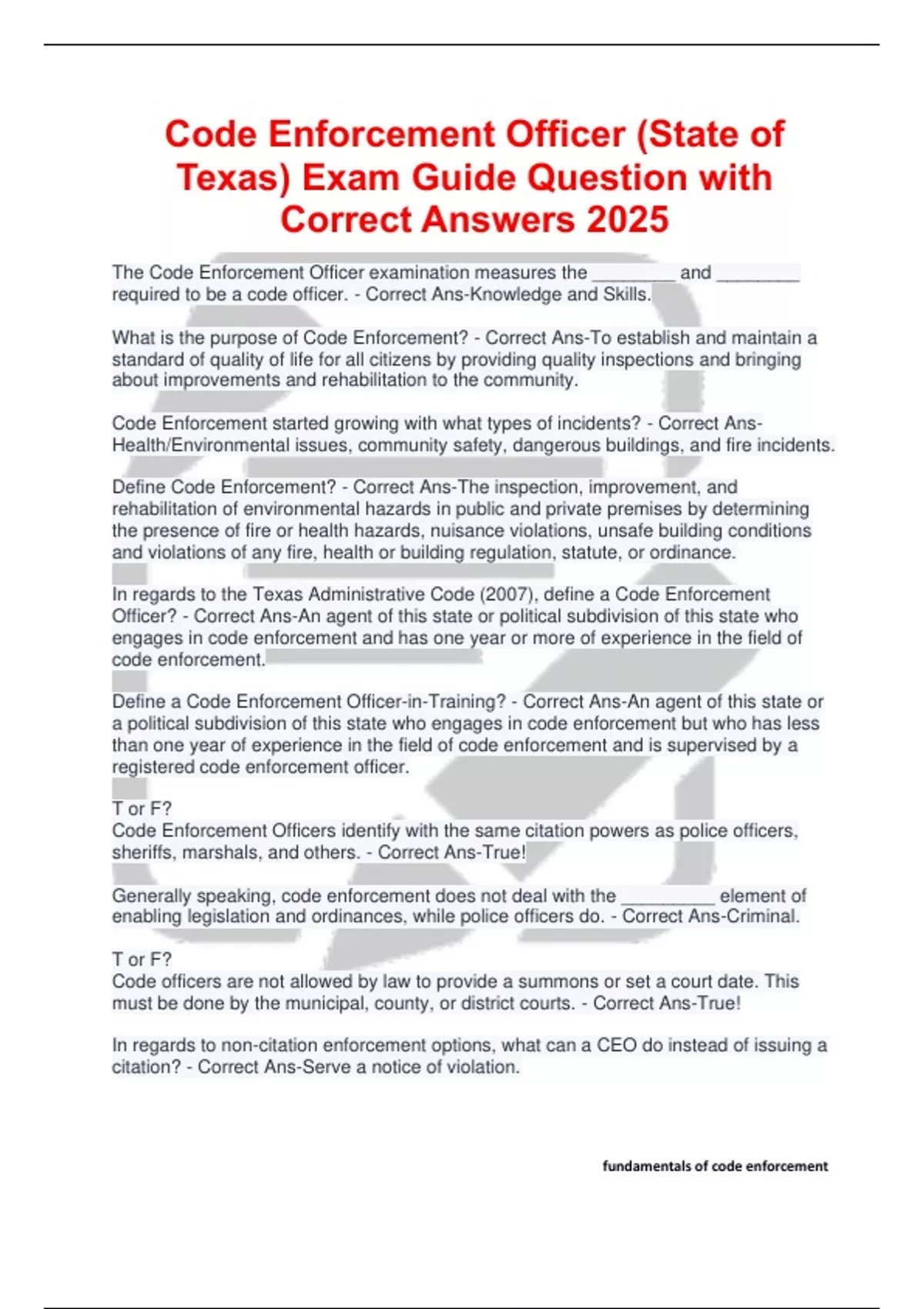 The Code Enforcement Officer examination measures the ________ and ________ required to be a code officer. - Correct Ans-Knowledge and Skills. What is the purpose of Code Enforcement? - Correct Ans-To establish and maintain a standard of quality of life for all citizens by providing quality inspections and bringing about improvements and rehabilitation to the community. Code Enforcement started growing with what types of incidents? - Correct Ans-Health/Environmental issues, community safety, dangerous buildings, and fire incidents. Define Code Enforcement? - Correct Ans-The inspection, improvement, and rehabilitation of environmental hazards in public and private premises by determining the presence of fire or health hazards, nuisance violations, unsafe building conditions and violations of any fire, health or building regulation, statute, or ordinance. In regards to the Texas Administrative Code (2007), define a Code Enforcement Officer? - Correct Ans-An agent of this state or political subdivision of this state who engages in code enforcement and has one year or more of experience in the field of code enforcement. Define a Code Enforcement Officer-in-Training? - Correct Ans-An agent of this state or a political subdivision of this state who engages in code enforcement but who has less than one year of experience in the field of code enforcement and is supervised by a registered code enforcement officer. T or F? Code Enforcement Officers identify with the same citation powers as police officers, sheriffs, marshals, and others. - Correct Ans-True! Generally speaking, code enforcement does not deal with the _________ element of enabling legislation and ordinances, while police officers do. - Correct Ans-Criminal. T or F? Code officers are not allowed by law to provide a summons or set a court date. This must be done by the municipal, county, or district courts. - Correct Ans-True! In regards to non-citation enforcement options, what can a CEO do instead of issuing a citation? - Correct Ans-Serve a notice of violation. Are trash, refuse, rubbish, debris, junk motor vehicles, high grass and weeds, nuisances, and zoning worth risking personal safety? - Correct Ans-Hell NO! Being prepared is one way in which CEO's help protect themselves. Prepared is an acronym that stands for what? - Correct Ans-Proactive, Responsive, Empathetic, Patient, Alert, Ready, Educated, and Disciplined. The purpose of Code Enforcement Association of Texas (CEAT) is what? - Correct Ans-To study and advance the science and practice of code enforcement through certification designed to promote the interests of the profession. On a national level, what is the association that represents code enforcement officers? - Correct Ans-American Association of Code Enforcement (AACE) What is the International Code Council? - Correct Ans-Code council involved in code on an international scale. There are substantial advantages in combining the efforts of existing code organizations to produce a single set of codes. What is the State of Texas definition of Code Enforcement? a. The ability to arrest anyone at anytime. b. The abilitiy to write ordinances, inspect property, issue citations, and arrest violators. c. The inspection, improvement and rehabilitation of environmental hazards in public and private premises by determining the presence of fire or health hazards, nuisance violations, unsafe building conditions, and violations of any fire, health, or building regulation, state, or ordinance. d. The enforcement of the federal code. - Correct Ans-C The State of Texas defines a code enforcement officer as: a. An agent of this state or a political subdivision of this state who engages in code enforcement and has one year or more of experience in the field of code enforcement. b. An agent of this state or a political subdivision of this state who engages in code enforcement and has three months or more of experience in the field of code enforcement. c. An agent of this state or a political subdivision of this state who engages in code enforcement and has six months or more of experience in the field of code enforcement. d. An agent of this state or a political subdivision of this state who engages in code enforcement and has five years or more of experience in the field of code enforcement. - Correct Ans-A