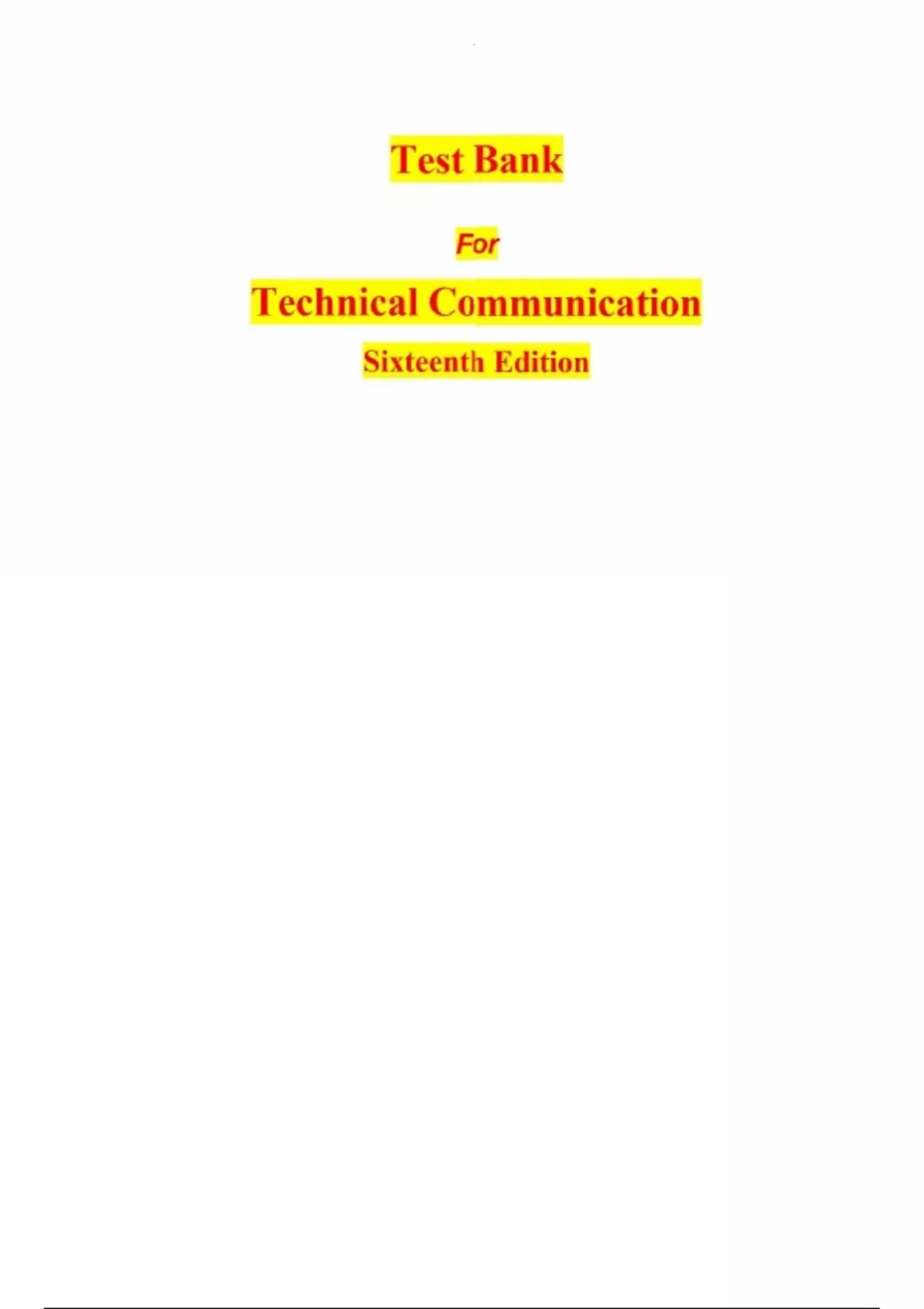 Test Bank For Technical Communication, 16th Edition by John M. Lannon-1. Technical communication rarely focuses on the author’s personal thoughts or feelings. 2. Few technical documents have a persuasive purpose. 3. Phone calls, conversations, and meetings have largely replaced the need for written documents. 4. Most technical writing is done in teams. 5. All documents have some persuasive aspect, even if the persuasion is implicit. 6. Technical writers cannot be held responsible for faulty information, but the companies they work for can. 7. A technical communicator might be called an information architect, technical editor, or content developer. 8. Digital communication is the universal globalstandard for technical communication. Fill-In-The-Blank Questions 9. - centered documents focus on what people need to learn, do, or decide. 10. Communication and critical thinking are examples of skills. 11. Most technical documents are intended to persuade, inform, or . Multiple Choice Questions 12. Which document provides an example of technical writing primarily intended to persuade? (a) a grant proposal to obtain funding from a community agency (b) a training manual for coffee shop employees for making different drinks (c) instructions for assembling a desk (d) a handout from a doctor explaining how to prepare forsurgery 13. When trying to make sense of information, people should . (a) consider how others might interpret the information (b) rely on Internet search technology to judge the credibility of a source (c) assume that information found by them should also be shared (d) let the data speak for themselves 14. Effective technical documents . (a) use visuals as a substitute for words when possible (b) include tangential information as a bonus to readers (c) avoid white space (d) stay away from integrating links 15. Compared to the others, which statement is most accurate? (a) As long as a document is persuasive, it need not be clear and efficient. (b) Instructions and procedures are two types of persuasive documents. (c) At some point, every job involves being a technical communicator. (d) Technical documentsfocus on the writer’s needs. 16. Technical communication . (a) avoids using chat sessions (b) generally focuses on highly trained technical audiences (c) emphasizes writing long technical passages (d) may include blog posts 17. When communicating globally, it is important to . (a) consistently deliver documents using informal language (b) emphasize face-to-face communication to ensure everyone gets to know each other (c) make sure to include hard-copy formats (d) adjust the form of communication to the specific cultural context
