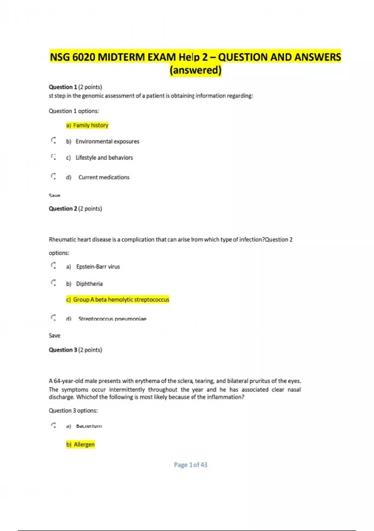 Question 1 (2 points) st step in the genomic assessment of a patient is obtaining information regarding: Question 1 options: a) Family history b) Environmental exposures c) Lifestyle and behaviors d) Current medications Save Question 2 (2 points) Rheumatic heart disease is a complication that can arise from which type of infection?Question 2 options: a) Epstein-Barr virus b) Diphtheria c) Group A beta hemolytic streptococcus d) Streptococcus pneumoniae Save Question 3 (2 points) A 64-year-old male presents with erythema of the sclera, tearing, and bilateral pruritus of the eyes. The symptoms occur intermittently throughout the year and he has associated clear nasal discharge. Whichof the following is most likely because of the inflammation? Question 3 options: a) Bacterium b) Allergen Page 2 of 43 c) Virus d) Fungi Save Question 4 (2 points) Dan G., a 65-year-old man, presents to your primary care office for the evaluation of chest pain and left- sided shoulder pain. Pain begins after strenuous activity, including walking. Pain is characteriked as dull,aching; 8/10 during activity, otherwise 0/10. Began a few months ago, intermittent, aggravated by exercise, and relieved by rest. Has occasional nausea. Pain is retrosternal, radiating to left shoulder, definitely affects quality of life by limiting activity. Pain is worse today; did not go away after he stopped walking. BP 120/80. Pulse 72 and regular. Normal heart sounds, S1 and S2, no murmurs. Which of the following differential diagnoses would be most likely? Question 4 options: a) Musculoskeletal chest wall syndrome with radiation b) Esophageal motor disorder with radiation c) Acute cholecystitis with cholelithiasis d) Coronary artery disease with angina pectoris Save Question 5 (2 points) Which disease process typically causes episodic right upper quadrant pain, epigastric pain or chest pain that can last 4-6 hours or less, often radiates to the back (classically under the right shoulder blade) and is often accompanied by nausea or vomiting and often follows a heavy, fatty meal. Question 5 options: a) Acute pancreatitis b) Duodenal ulcer c) Biliary colic d) Cholecystitis Save Question 6 (2 points) Page 3 of 43 Helicobacter pylori is implicated as a causative agent in the development of duodenal or gastric ulcers. What teaching should the nurse practitioner plan for a patient who has a positive Helicobacterpylori test? Question 6 options: a) It is highly contagious and a mask should be worn at home. b) Treatment regimen is multiple lifetime medications. c) Treatment regimen is multiple medications taken daily for a few weeks. d) Treatment regimen is complicated and is not indicated unless the patient is symptomatic. Save Question 7 (2 points) An obese middle-aged client presents with a month of nonproductive irritating cough without fever. Healso reports occasional morning hoarseness. What should the differential include? Question 7 options: a) Atypical pneumonia b) Peptic ulcer disease c) Gastroesophageal reflux d) Mononucleosis (Epstein-Barr)
