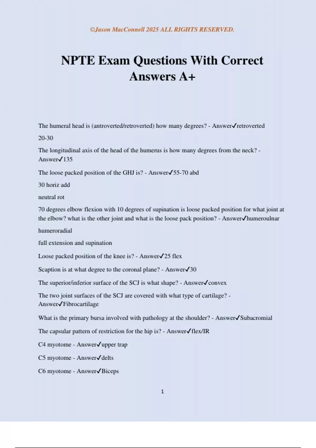 NPTE Exam Questions With Correct Answers A+ The humeral head is (antroverted/retroverted) how many degrees? - Answerretroverted 20-30 The longitudinal axis of the head of the humerus is how many degrees from the neck? - Answer135 The loose packed position of the GHJ is? - Answer55-70 abd 30 horiz add neutral rot 70 degrees elbow flexion with 10 degrees of supination is loose packed position for what joint at the elbow? what is the other joint and what is the loose pack position? - Answerhumeroulnar humeroradial full extension and supination Loose packed position of the knee is? - Answer25 flex Scaption is at what degree to the coronal plane? - Answer30 The superior/inferior surface of the SCJ is what shape? - Answerconvex The two joint surfaces of the SCJ are covered with what type of cartilage? - AnswerFibrocartilage What is the primary bursa involved with pathology at the shoulder? - AnswerSubacromial The capsular pattern of restriction for the hip is? - Answerflex/IR C4 myotome - Answerupper trap C5 myotome - Answerdelts C6 myotome - AnswerBiceps ©Jason MacConnell 2025 ALL RIGHTS RESERVED. 2 C7 myotome - Answerwrist flex, tris C8 myotome - Answerthumb abd T1 myotome - Answerinterossei C5 reflex - Answerbiceps C6 reflex - Answerbrachioradialis C7 reflex - Answertriceps Scapulohumeral rhythm is what? The first ______ degrees of elevation occur at the GHJ. - Answer2:1 30-60 Which elbow ligament is fan-shaped and runs from the epicondyle to the annular ligament? - AnswerRadial collateral What is the name of the elbow ligament that extends from the radial notch of the ulna to the neck of the radius? - AnswerQuadrate Which elbow ligaments resists valgus force? - AnswerMedal collateral How strong is the resistance of the elbow's lateral collateral ligament to varus forces? - Answerminimal (due to its attachment to the annular ligament) During extension the proximal ulna glides in which direction? - Answermedially During flexion, which collateral ligaments of the fingers tighten? During extension? - Answerall Volar Normal angle of inclination of the hip is what? Coxa valga is defined as what? Coxa vara? - Answer115-125 >125 <115 Femoral neck angle is normally what degree of anteversion? What is considered excessive anteversion? Retroversion? - Answer10-15 >25-30 <10 L2 myotome - Answerhip flex
