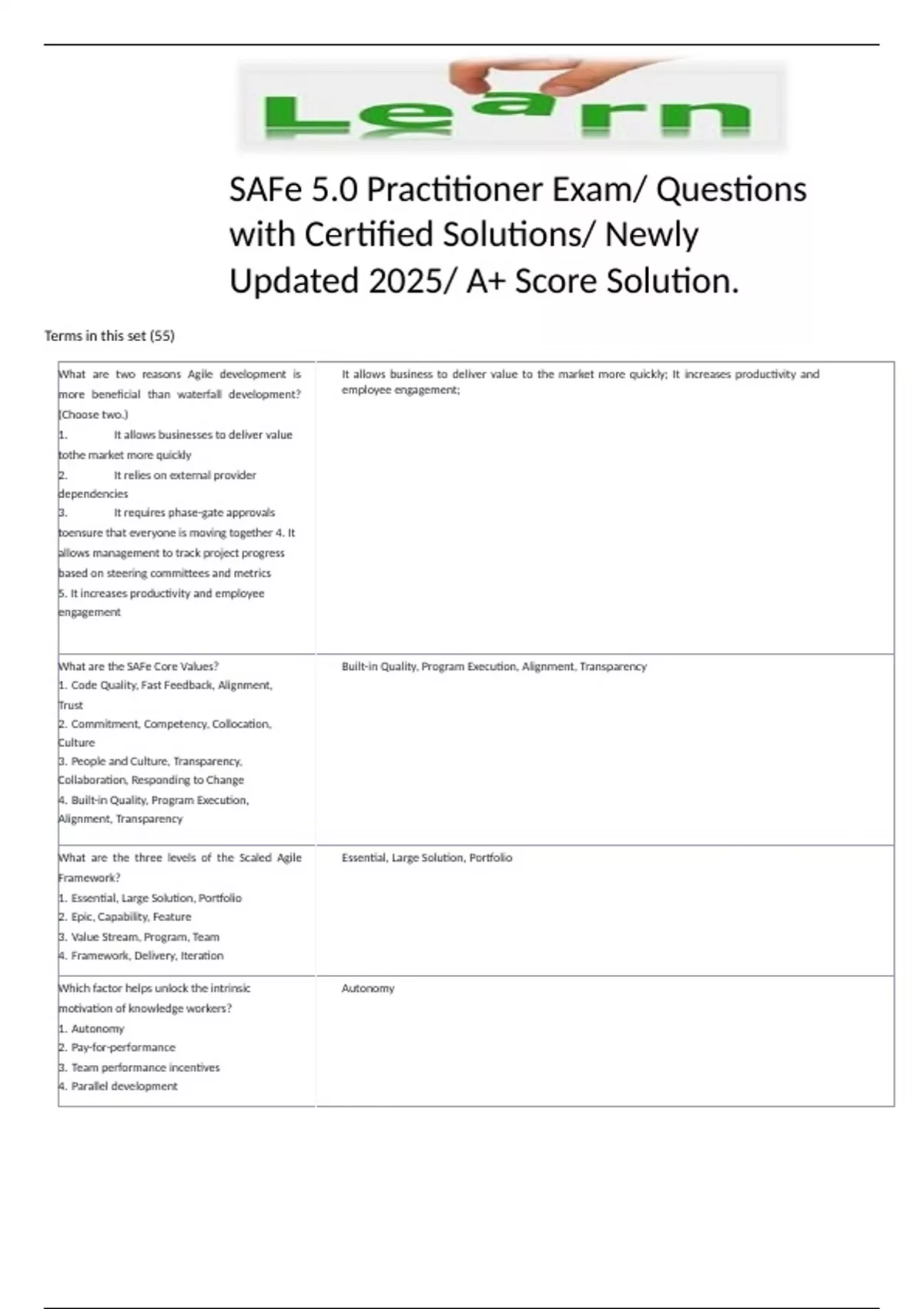 SAFe 5.0 Practitioner Exam/ Questions with Certified Solutions/ Newly Updated 2025/ A+ Score Solution. What are two reasons Agile development is more beneficial than waterfall development? (Choose two.) 1. It allows businesses to deliver value tothe market more quickly 2. It relies on external provider dependencies 3. It requires phase-gate approvals toensure that everyone is moving together 4. It allows management to track project progress based on steering committees and metrics 5. It increases productivity and employee engagement It allows business to deliver value to the market more quickly; It increases productivity and employee engagement; What are the SAFe Core Values? 1. Code Quality, Fast Feedback, Alignment, Trust 2. Commitment, Competency, Collocation, Culture 3. People and Culture, Transparency, Collaboration, Responding to Change 4. Built-in Quality, Program Execution, Alignment, Transparency Built-in Quality, Program Execution, Alignment, Transparency What are the three levels of the Scaled Agile Framework? 1. Essential, Large Solution, Portfolio 2. Epic, Capability, Feature 3. Value Stream, Program, Team 4. Framework, Delivery, Iteration Essential, Large Solution, Portfolio Which factor helps unlock the intrinsic motivation of knowledge workers? 1. Autonomy 2. Pay-for-performance 3. Team performance incentives 4. Parallel development Autonomy
