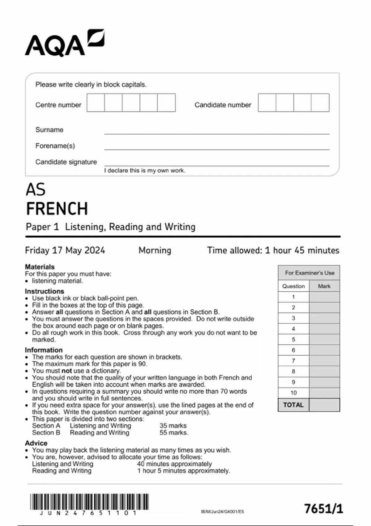AQA As french PAPER 1 QUESTION PAPER 2024 (7651/1)