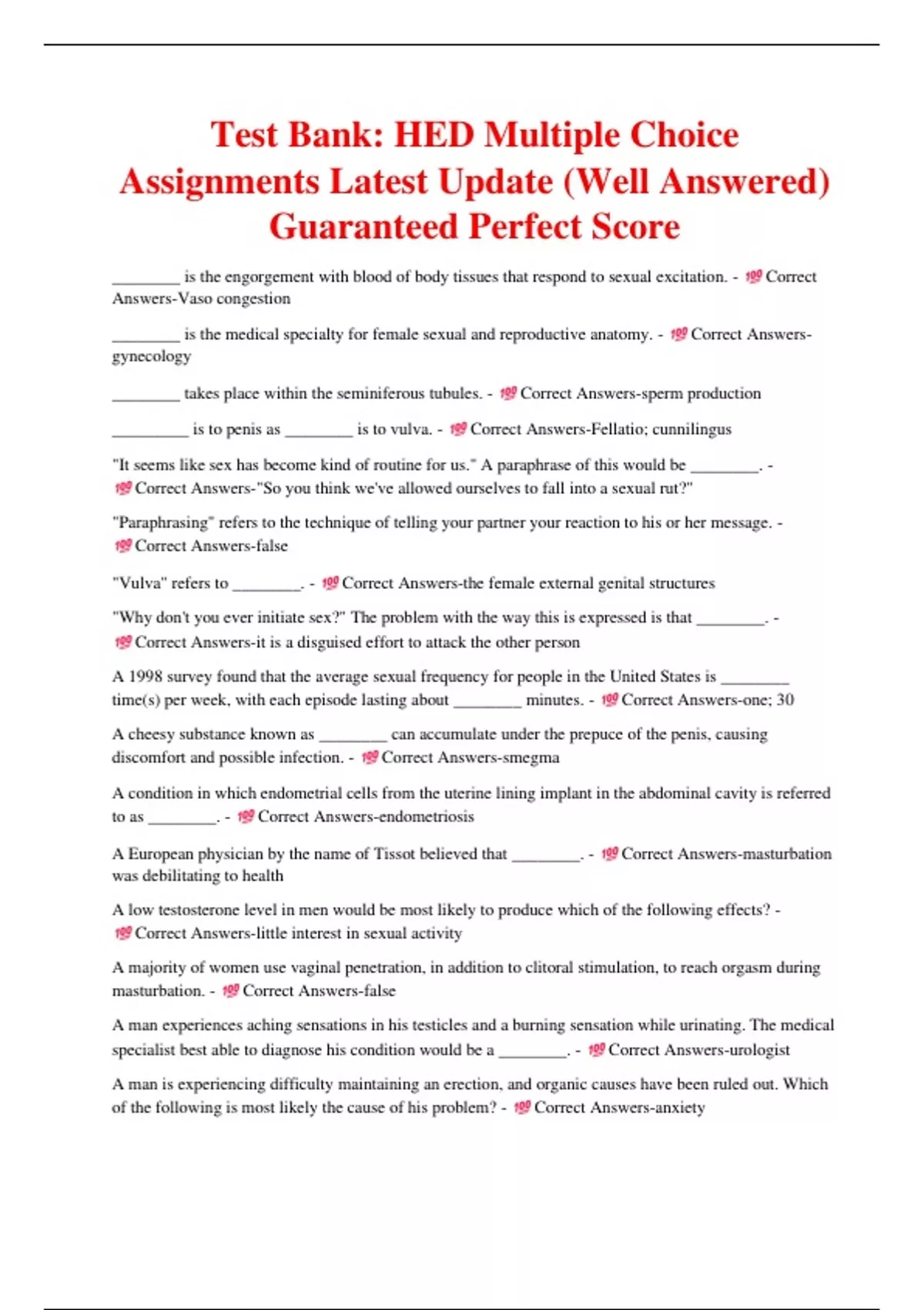 Test Bank: HED Multiple Choice Assignments Latest Update (Well Answered) Guaranteed Perfect Score ________ is the engorgement with blood of body tissues that respond to sexual excitation. - Correct Answers-Vaso congestion ________ is the medical specialty for female sexual and reproductive anatomy. - Correct Answersgynecology ________ takes place within the seminiferous tubules. - Correct Answers-sperm production _________ is to penis as ________ is to vulva. - Correct Answers-Fellatio; cunnilingus "It seems like sex has become kind of routine for us." A paraphrase of this would be ________. - Correct Answers-"So you think we've allowed ourselves to fall into a sexual rut?" "Paraphrasing" refers to the technique of telling your partner your reaction to his or her message. - Correct Answers-false "Vulva" refers to ________. - Correct Answers-the female external genital structures "Why don't you ever initiate sex?" The problem with the way this is expressed is that ________. - Correct Answers-it is a disguised effort to attack the other person A 1998 survey found that the average sexual frequency for people in the United States is ________ time(s) per week, with each episode lasting about ________ minutes. - Correct Answers-one; 30 A cheesy substance known as ________ can accumulate under the prepuce of the penis, causing discomfort and possible infection. - Correct Answers-smegma