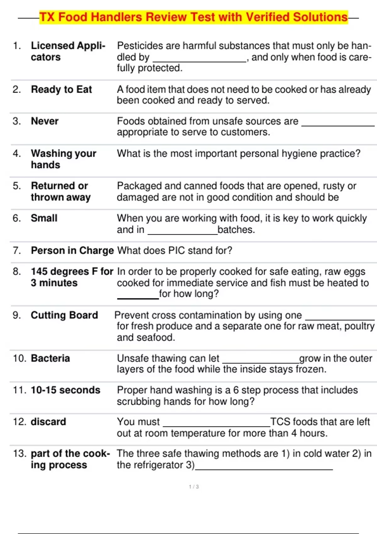 TX Food Handlers Review Test with Verified Solutions 1. Licensed Appli- cators Pesticides are harmful substances that must only be han- dled by , and only when food is care- fully protected. 2. Ready to Eat A food item that does not need to be cooked or has already been cooked and ready to served. 3. Never Foods obtained from unsafe sources are appropria