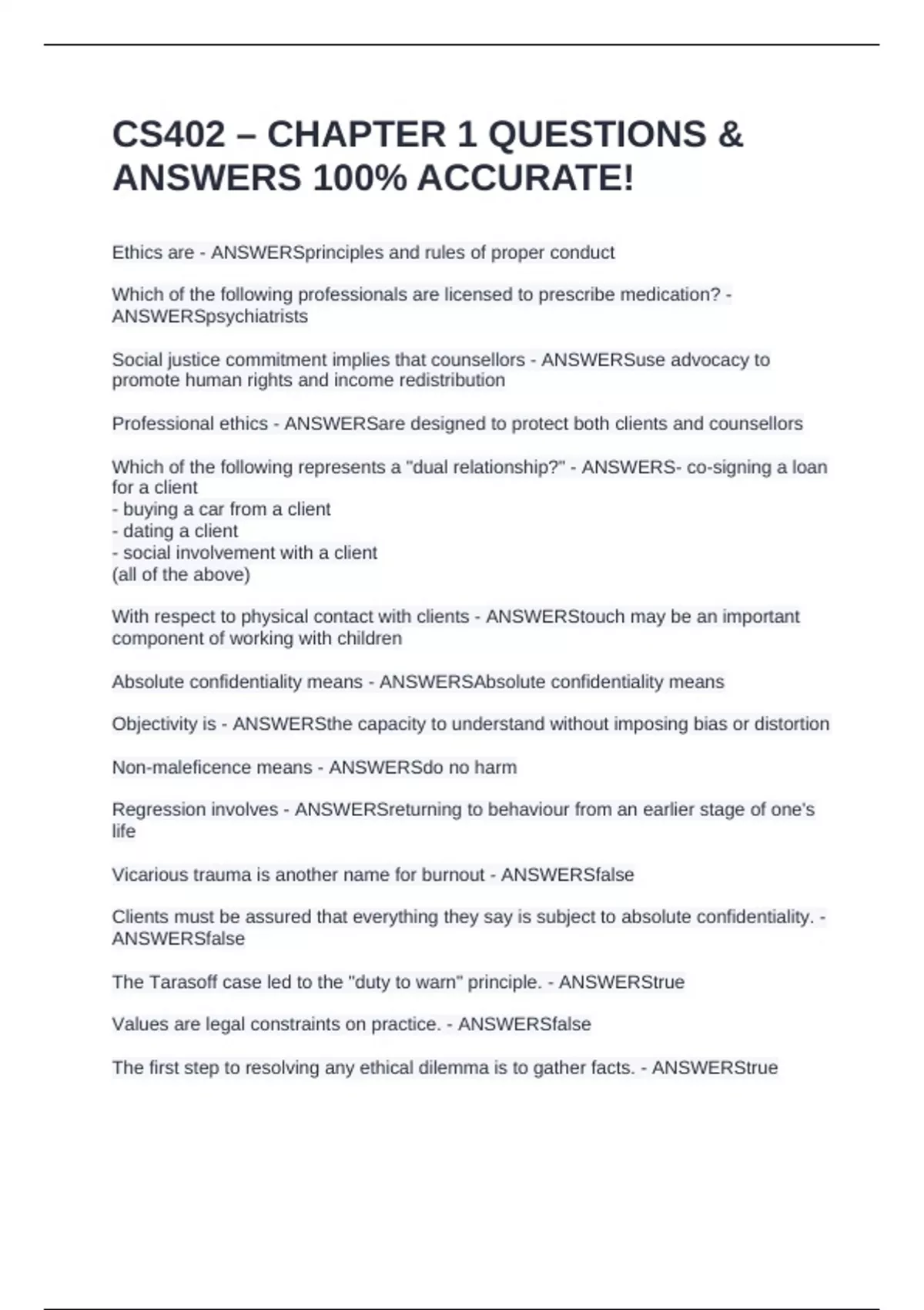 Ethics are - ANSWERSprinciples and rules of proper conduct Which of the following professionals are licensed to prescribe medication? - ANSWERSpsychiatrists Social justice commitment implies that counsellors - ANSWERSuse advocacy to promote human rights and income redistribution Professional ethics - ANSWERSare designed to protect both clients and counsellors Which of the following represents a "dual relationship?" - ANSWERS- co-signing a loan for a client - buying a car from a client - dating a client - social involvement with a client (all of the above) With respect to physical contact with clients - ANSWERStouch may be an important component of working with children Absolute confidentiality means - ANSWERSAbsolute confidentiality means Objectivity is - ANSWERSthe capacity to understand without imposing bias or distortion Non-maleficence means - ANSWERSdo no harm Regression involves - ANSWERSreturning to behaviour from an earlier stage of one's life Vicarious trauma is another name for burnout - ANSWERSfalse Clients must be assured that everything they say is subject to absolute confidentiality. -