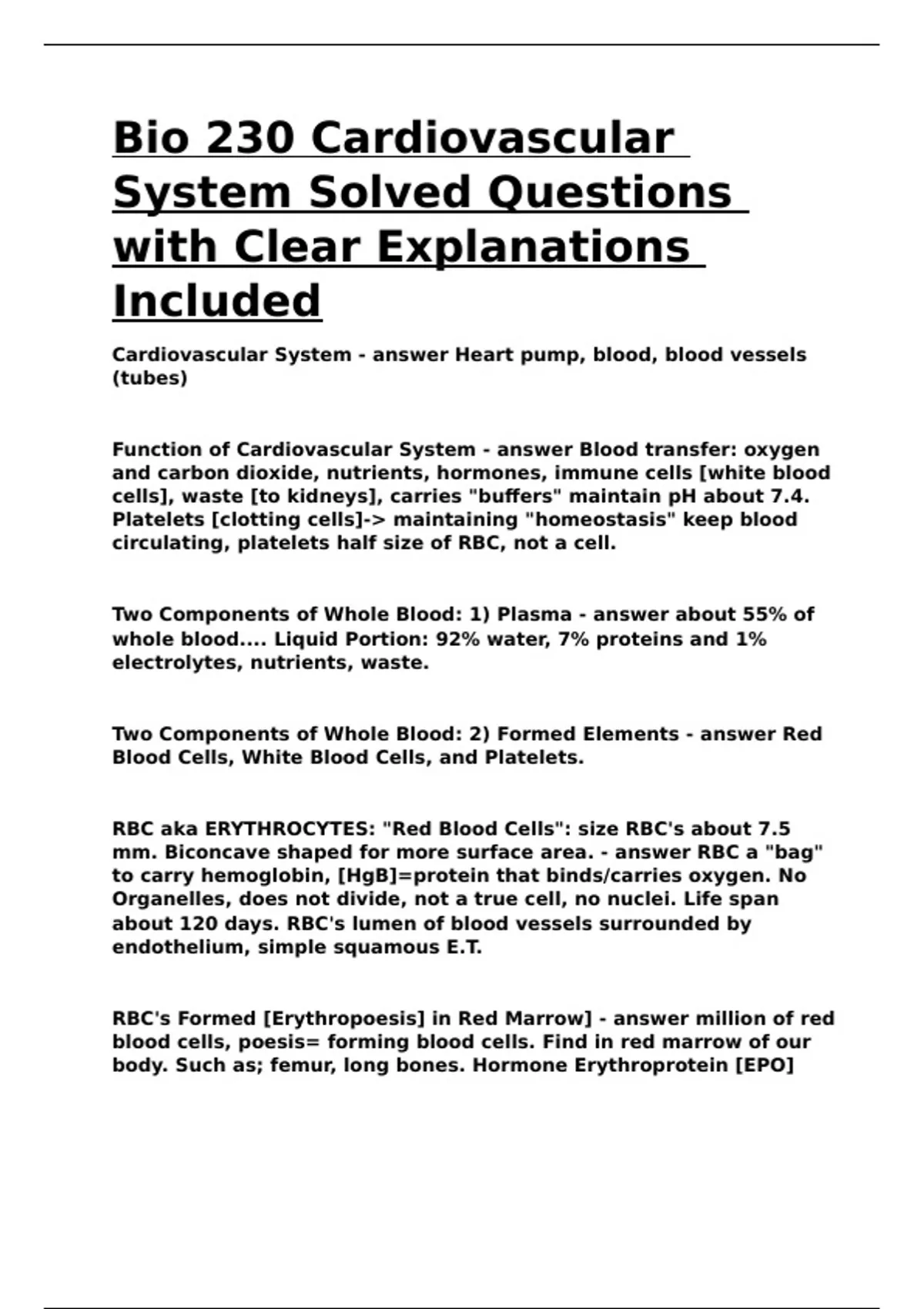 Bio 230 Cardiovascular System Solved Questions with Clear Explanations Included.