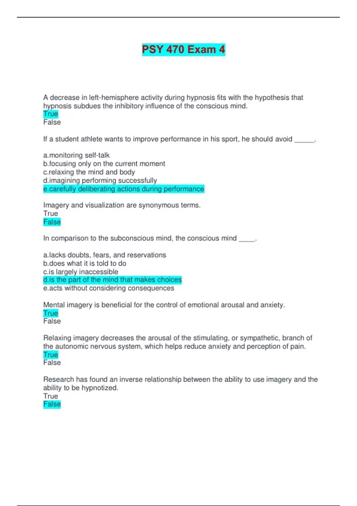 PSY 470 Exam 4 | Questions and Answers A decrease in left-hemisphere activity during hypnosis fits with the hypothesis that hypnosis subdues the inhibitory influence of the conscious mind. True False If a student athlete wants to improve performance in his sport, he should avoid _____. oring self-talk ing only on the current moment ing the mind and body ning performing successfully ully deliberating actions during performance Imagery and visualization are synonymous terms. True False In comparison to the subconscious mind, the conscious mind ____. doubts, fears, and reservations what it is told to do largely inaccessible the part of the mind that makes choices without considering consequences Mental imagery is beneficial for the control of emotional arousal and anxiety. True False Relaxing imagery decreases the arousal of the stimulating, or sympathetic, branch of the autonomic nervous system, which helps reduce anxiety and perception of pain. True False Research has found an inverse relationship between the ability to use imagery and the ability to be hypnotized. True False Research suggests that there is no real difference between an imagined event and a "real" event you perceive in your physical experience as far as how your mind interprets its meaning. True False The father of hypnosis, Franz Mesmer, believed that there was a magical force that flowed from hypnotist to patient, which he called ____. tic power ng touch l magnetism tual connection rism To experience the relaxation benefits of guided imagery, you must be able to see the mental image clearly. True False Whatever the conscious mind focuses on, believes, thinks, and directs is what the subconscious mind responds to; it follows through without question. True False When you are under hypnosis, _____. are less critical and disbelieving are more responsive to suggestions left hemisphere is more active attention is less focused parasympathetic nervous system is deactivated Which benefit is a common reason to use imagery? ase left hemisphere activity ence other people ve confidence and positive thinking ol visual and auditory hallucinations ase performance skills Which term describes a flow of thought that includes sensory qualities from one or more of the senses? enics ry nal emotive thinking sis lization Your conscious mind contains all of your thoughts, images, and memories. True False A mental device used as a point of focus during meditation, such as a repeated word, sound, or phrase, is known as a _____. la a a ian rizer Contemplation meditation is a form of mindfulness. True False Jeri wants to try thought watching. She should picture herself sitting peacefully _____. a warm, sandy beach the bottom of a clear lake the top of a mountain a peaceful meadow a quiet room Meditation can bring about the relaxation response, as long as it has _____. a.a quiet environment b.a word to focus on h muscle constriction active attitude ing background music Meditation is the process of systematically allowing the mind to focus gently on a single item. True False Meditation is usually done in a comfortable seated position rather than lying down. True False Meditation should only be done in a place where it is dark and quiet. True False Researchers have concluded that the key to successful meditation is the use of a unique word, sound, or phrase determined specifically for the individual. True False Sitting in the lotus position is necessary for all forms of meditation. True False The key to successful meditation is to completely empty your mind of all thoughts. True False When Kiran meditates, he experiences decreased breathing rate, decreased heart rate, and slower brainwave patterns similar to sleeping. This level of deep rest is called a(n) _____ state. metabolic etabolic When you meditate using a mantra or simple meditation, what should the intention be? a.To clear your mind of all thoughts. b.Imagine sitting by a still lake and seeing ripples flowing out from the center one at a time. c.Repeat the mantra with as little effort as possible when you think of it. d.Spell the mantra over and over in your mind. e.Try with all of your might to continue repeating the mantra. Don't let the mantra fade. Which type of meditation is traced back to Buddha? mplation meditation a meditation ht watching hing meditation a meditation _____ are the energy centers in the body through which spiritual and emotional energies flow. a.Chakras b.Mantras c.Nerve synapses d.Prana e.Lymphatic pathways Mantra meditation takes years of practice in order to notice any positive health effects. True False Asanas are gentle stretching movements designed to rejuvenate and bring balance to the entire body. True False In Hatha yoga, the emphasis is on giving complete mental attention to each movement to the exclusion of everything else. True False In order to successfully practice yoga, you must also adopt the Hindu philosophy. True False Iyengar yoga is a classical style of yoga that is softer on the body and is well-suited for beginners because it uses props, such as chairs, straps, blocks, pillows, and sandbags, to compensate for a lack of flexibility. True False Jordin is pretty healthy and works out a lot. She's looking for a yoga style that is focused on developing strength and stamina, rather than on meditation. Which type of yoga should she pursue? lini yoga ar yoga nga yoga yoga anda yoga Sivananda yoga is done in a hot room, 90 to 105 degrees Fahrenheit, replicating the temperature of the birthplace of yoga. True False Static poses (asanas) should be held in the stretching position for at least ____ seconds. a.15 b.20 c.5 d.10 e.30 The focus of hatha yoga is on three branches of yoga, including ____. d rooms aint r ance hing techniques The term "yoga" comes from the Sanskrit root yuj, which means ____. focus the mind breathe deeply flexibility strengthen the core yoke together The yoga sage Patanjali is believed to have assembled a collection of yoga theories a