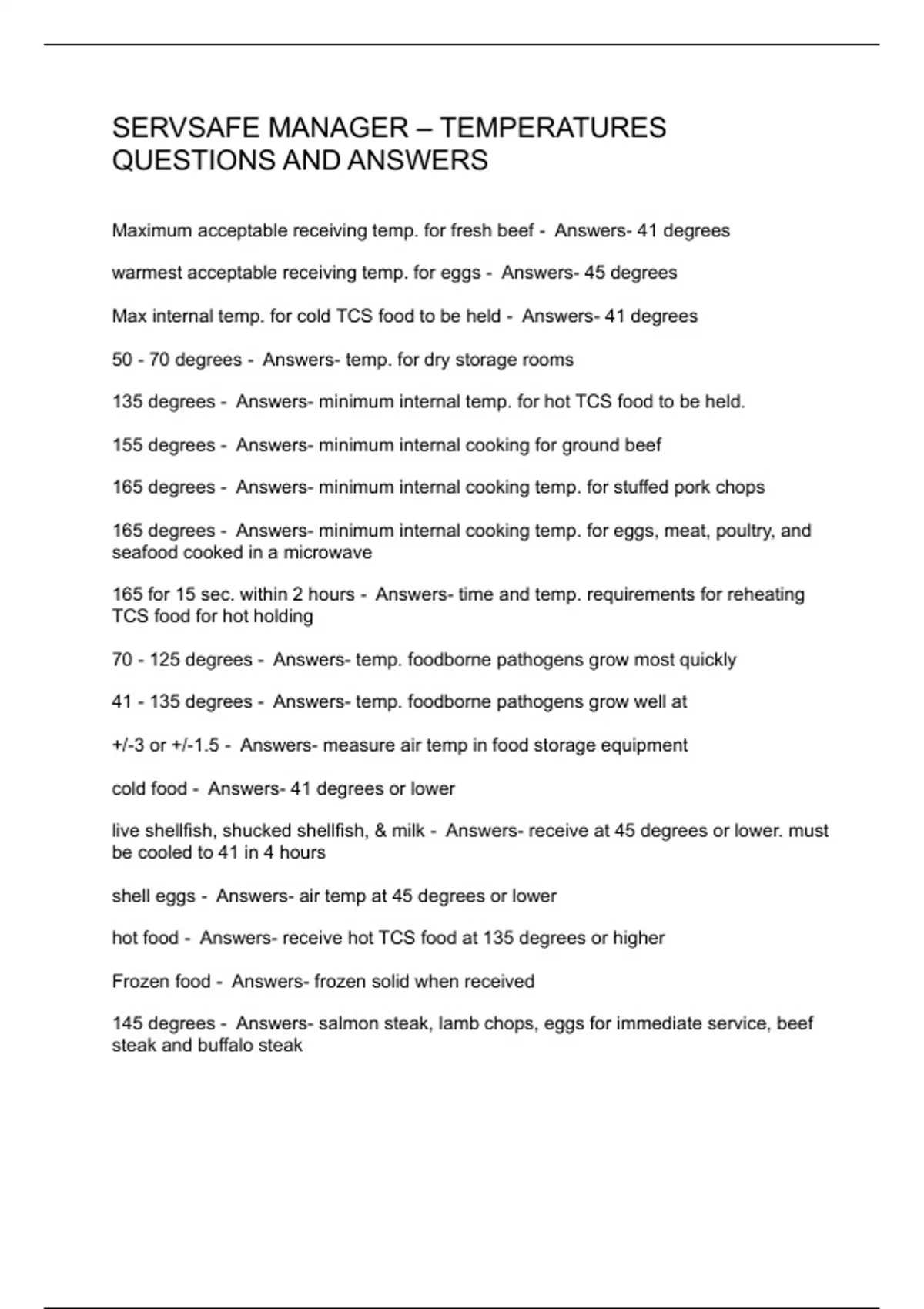 165 degrees - Answers- minimum internal cooking temp. for eggs, meat, poultry, and