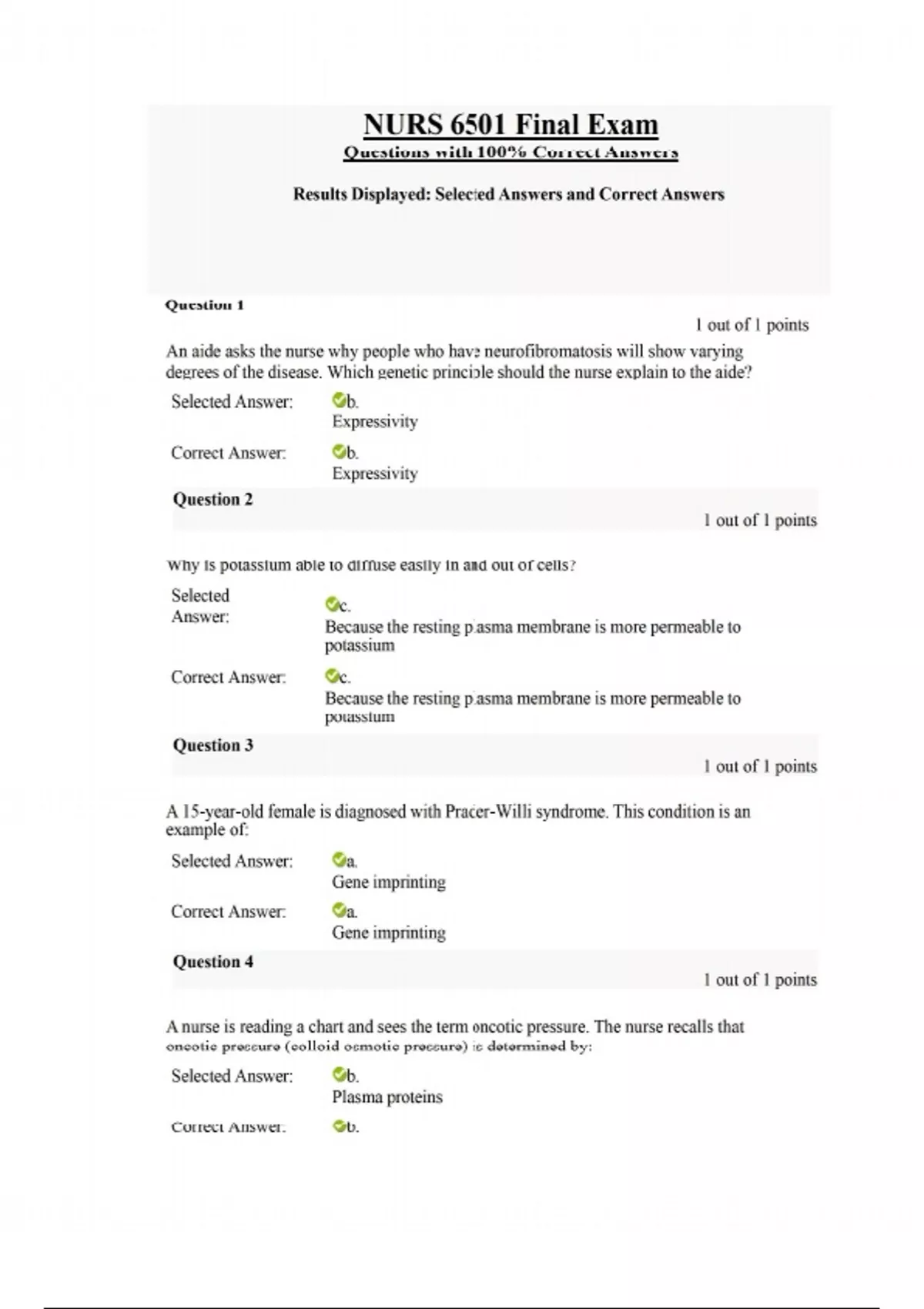Question 1 1 out of 1 points An aide asks the nurse why people who have neurofibromatosis will show varying degrees of the disease. Which genetic principle should the nurse explain to the aide? Selected Answer: b. Expressivity Correct Answer: b. Expressivity Why is potassium able to diffuse easily in and out of cells? Selected Answer: c. Because the resting plasma membrane is more permeable to potassium Correct Answer: c. Because the resting plasma membrane is more permeable to potassium A 15-year-old female is diagnosed with Prader-Willi syndrome. This condition is an example of: Selected Answer: a. Gene imprinting Correct Answer: a. Gene imprinting A nurse is reading a chart and sees the term oncotic pressure. The nurse recalls that oncotic pressure (colloid osmotic pressure) is determined by: Selected Answer: b. Plasma proteins Correct Answer: b. NURS 6501 Final Exam Questions with 100% Correct Answers Results Displayed: Selected Answers and Correct Answers Question 5 1 out of 1 points Question 6 1 out of 1 points Question 7 1 out of 1 points Question 8 1 out of 1 points Question 9 1 out of 1 points Plasma proteins During childhood, the thymus decreases in size, and this is referred to as atrophy. Selected Answer: a. Physiologic Correct Answer: a. Physiologic What is the role of cytokines in cell reproduction? Selected Answer: a. Provide growth factor for tissue growth and development Correct Answer: a. Provide growth factor for tissue growth and development When a patient asks what causes cystic fibrosis, how should the nurse respond? Cystic fibrosis is caused by an gene. Selected Answer: d. Autosomal recessive Correct Answer: d. Autosomal recessive A patient has a heart attack that leads to progressive cell injury that causes cell death with severe cell swelling and breakdown of organelles. What term would the nurse use to define this process? Selected Answer: d. Necrosis Correct Answer: d. Necrosis A eukaryotic cell is undergoing DNA replication. In which region of the cell would most of the genetic information be contained? Question 10 1 out of 1 points Question 11 1 out of 1 points Question 12 1 out of 1 points Question 13 1 out of 1 points Question 14 1 out of 1 points Selected Answer: c. Nucleolus Correct Answer: c. Nucleolus A nurse is discussing the movement of fluid across the arterial end of capillary membranes into the interstitial fluid surrounding the capillary. Which process of fluid movement is the nurse describing? Selected Answer: a. Hydrostatic pressure Correct Answer: a. Hydrostatic pressure How are potassium and sodium transported across plasma membranes? Selected Answer: c. By adenosine triphosphate enzyme (ATPase) Correct Answer: c. By adenosine triphosphate enzyme (ATPase) The early dilation (swelling) of the cell’s endoplasmic reticulum results in: Selected Answer: c. Reduced protein synthesis Correct Answer: c. Reduced protein synthesis The ion transporter that moves Na+ and Ca2+ simultaneously in the same direction is an example of which of the following types of transport? Selected Answer: d. Symport Correct Answer: d. Symport Question 15 1 out of 1 points Question 16 1 out of 1 points Question 17 1 out of 1 points Question 18 1 out of 1 points A newborn male is diagnosed with albinism based on skin, eye, and hair appearance. Which finding will support this diagnosis? Selected Answer: Inability to convert tyrosine to DOPA (3,4 dihydroxyphenylalanine) Correct Answer: Inability to convert tyrosine to DOPA (3,4 dihydroxyphenylalanine) A patient wants to know the risk factors for Down syndrome. What is the nurse’s best response? Selected Answer: d. Pregnancy in women over age 35 Correct Answer: d. Pregnancy in women over age 35 The student is reviewing functions of the cell. The student would be correct in identifying the primary function of the nerve cell as: Selected Answer: d. Communication Correct Answer: d. Communication A 20-year-old pregnant female gives birth to a stillborn child. Autopsy reveals that the fetus has 92 chromosomes. What term may be on the autopsy report to describe this condition? Selected Answer: c. Tetraploidy Correct Answer: c. Tetraploidy Sodium and water accumulation in an injured cell are a direct result of: Selected Answer: a. Decreased ATP production Question 19 1 out of 1 points Question 20 1 out of 1 points Question 21 1 out of 1 points Question 22 1 out of 1 points Correct Answer: a. Decreased ATP production Which of the following mutations have the most significant effect on protein synthesis? Selected Answer: d. Frameshift mutations Correct Answer: d. Frameshift mutations A 55-year-old male with a 30-year history of smoking is examined for respiratory disturbance. Examination of his airway (bronchial) reveals that stratified squamous epithelial cells have replaced the normal columnar ciliated cells. This type of cellular adaptation is called: Selected Answer: c. Metaplasia Correct Answer: c. Metaplasia A nurse is teaching a patient with diabetes how glucose is transported from the blood to the cell. What type of transport system should the nurse discuss with the patient? Selected Answer: d. Passive-mediated transport (facilitated diffusion) Correct Answer: d. Passive-mediated transport (facilitated diffusion) What is the diagnosis of a 13-year-old female who has a karyotype that reveals an absent homologous X chromosome with only a single X chromosome present? Her features include a short stature, widely spaced nipples, reduced carrying angle at the elbow, and sparse body hair. Selected Answer: c. Turner syndrome Correct Answer: c. Turner syndrome Question 24 1 out of 1 points Question 25 1 out of 1 points Question 26 0 out of 0 points A cell is isolated, and electrophysiology studies reveal that the resting membrane potential is –70 millivolts. The predominant intracellular ion is Na+, and the predominant extracellular ion is K+. With voltage change, which of the following would result in an action potential? Selected