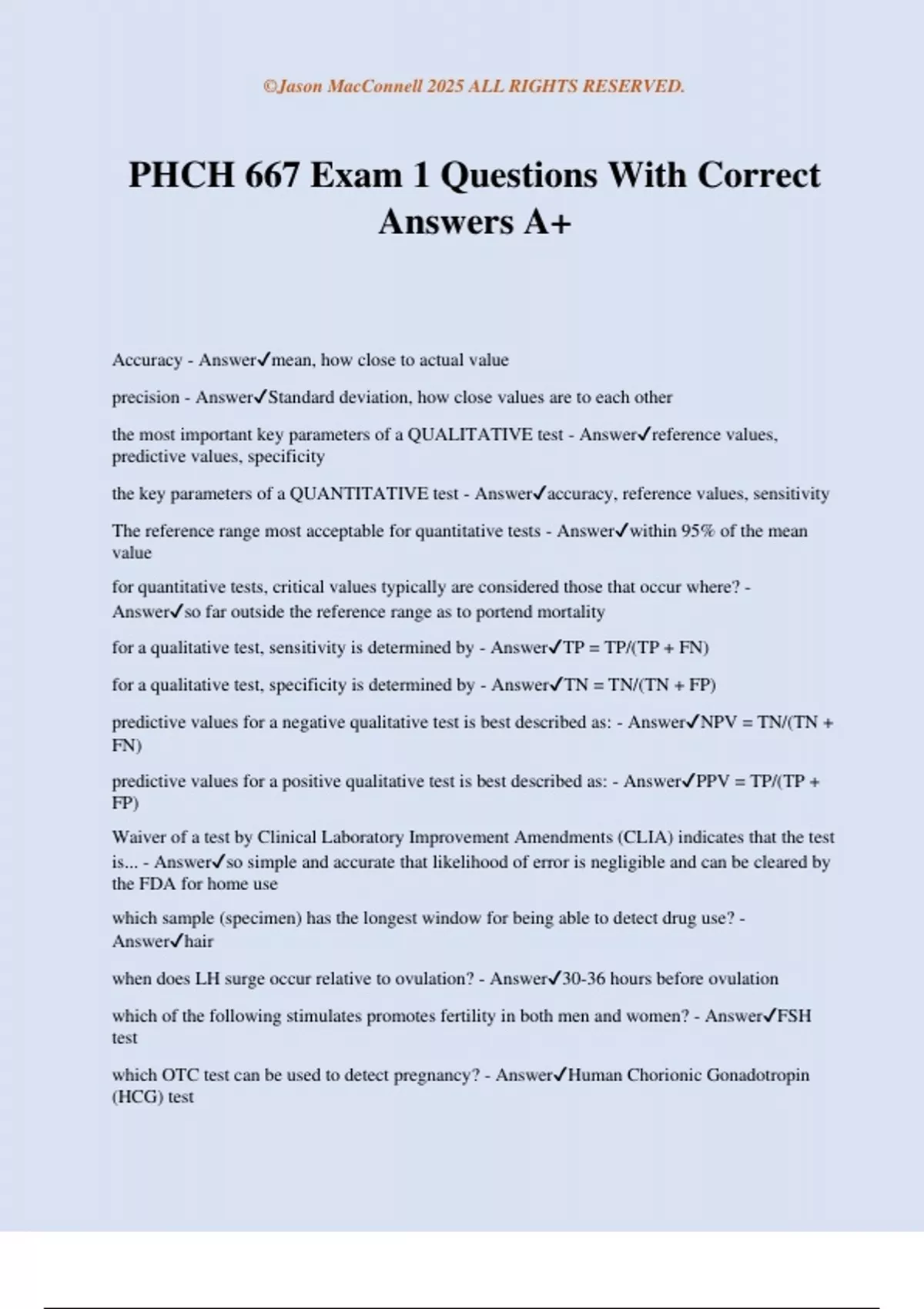 the key parameters of a QUANTITATIVE test - Answer✔accuracy, reference values, sensitivity