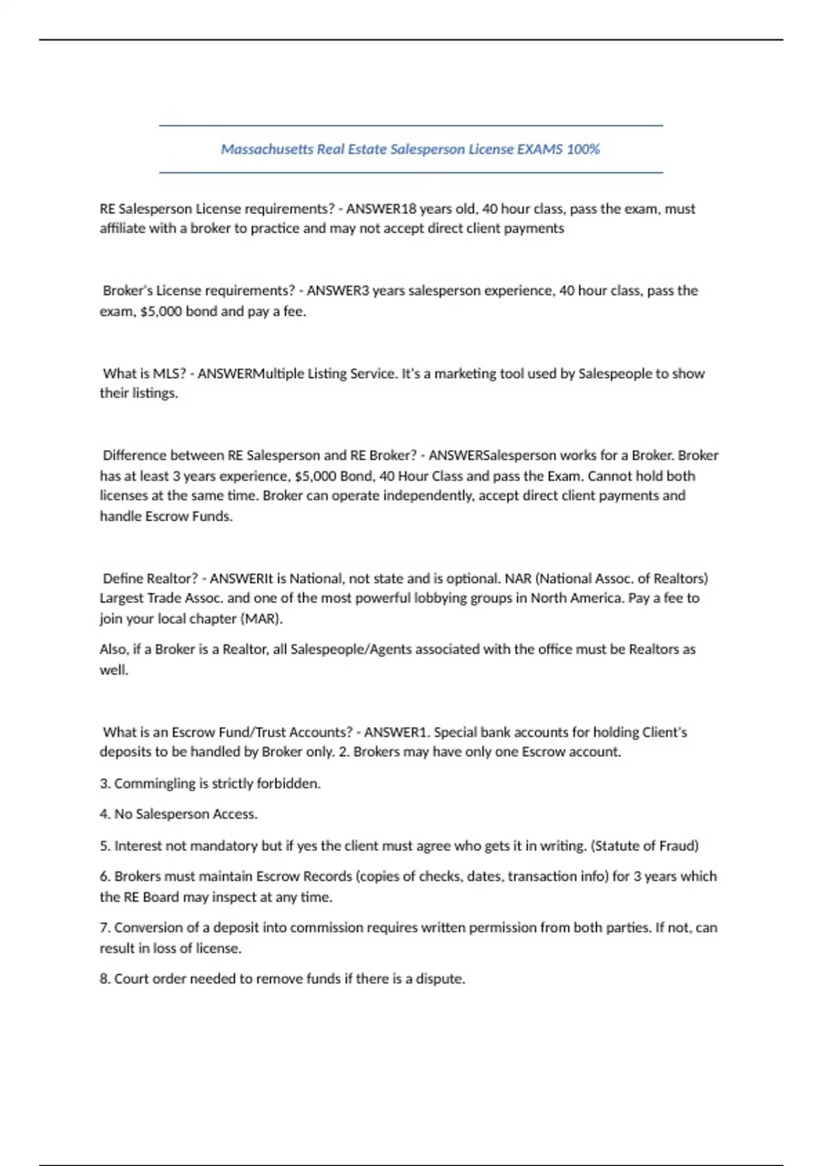 RE Salesperson License requirements? - ANSWER18 years old, 40 hour class, pass the exam, must