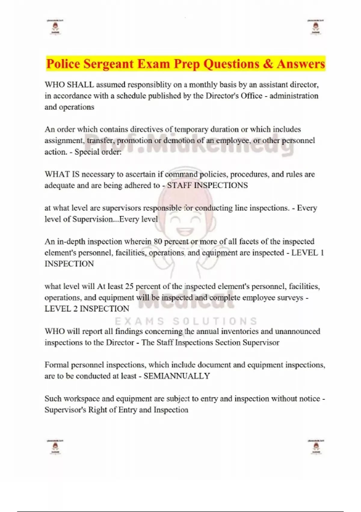 Police Sergeant Exam Prep Questions & Answers-WHO SHALL assumed responsiblity on a monthly basis by an assistant director, in accordance with a schedule published by the Director's Office - administration and operations An order which contains directives of temporary duration or which includes assignment, transfer, promotion or demotion of an employee, or other personnel action. - Special order: WHAT IS necessary to ascertain if command policies, procedures, and rules are adequate and are being adhered to - STAFF INSPECTIONS at what level are supervisors responsible for conducting line inspections. - Every level of Supervision...Every level An in-depth inspection wherein 80 percent or more of all facets of the inspected element's personnel, facilities, operations, and equipment are inspected - LEVEL 1 INSPECTION what level will At least 25 percent of the inspected element's personnel, facilities, operations, and equipment will be inspected and complete employee surveys - LEVEL 2 INSPECTION WHO will report all findings concerning the annual inventories and unannounced inspections to the Director - The Staff Inspections Section Supervisor Formal personnel inspections, which include document and equipment inspections, are to be conducted at least - SEMIANNUALLY Such workspace and equipment are subject to entry and inspection without notice - Supervisor's Right of Entry and Inspection departmentally-owned workspace and equipment; e.g., vehicles, lockers, desks, computer workstations and files, and cabinets for the mutual convenience of the Department and its personnel WHO SHALL ACCOMPLISH THE following 1. Make careful inspections of their subordinates for punctuality, appearance, weapons, other necessary equipment, and patrol vehicles 2.Monitor subordinates' activities relating to proper radio procedures, call distribution, calls holding, public contacts, and citizen complaints regarding service received. 3.Within 30 days after any discrepancy is detected, forward a memorandum to the district/bureau commander indicating corrective action taken or reasons for not taking corrective action, e.g., required training canceled - SERGEANT WHO IS RESPONSIBLE FOR COORDINATION AND TRAVEL - Office of Management and Budget (OMB)