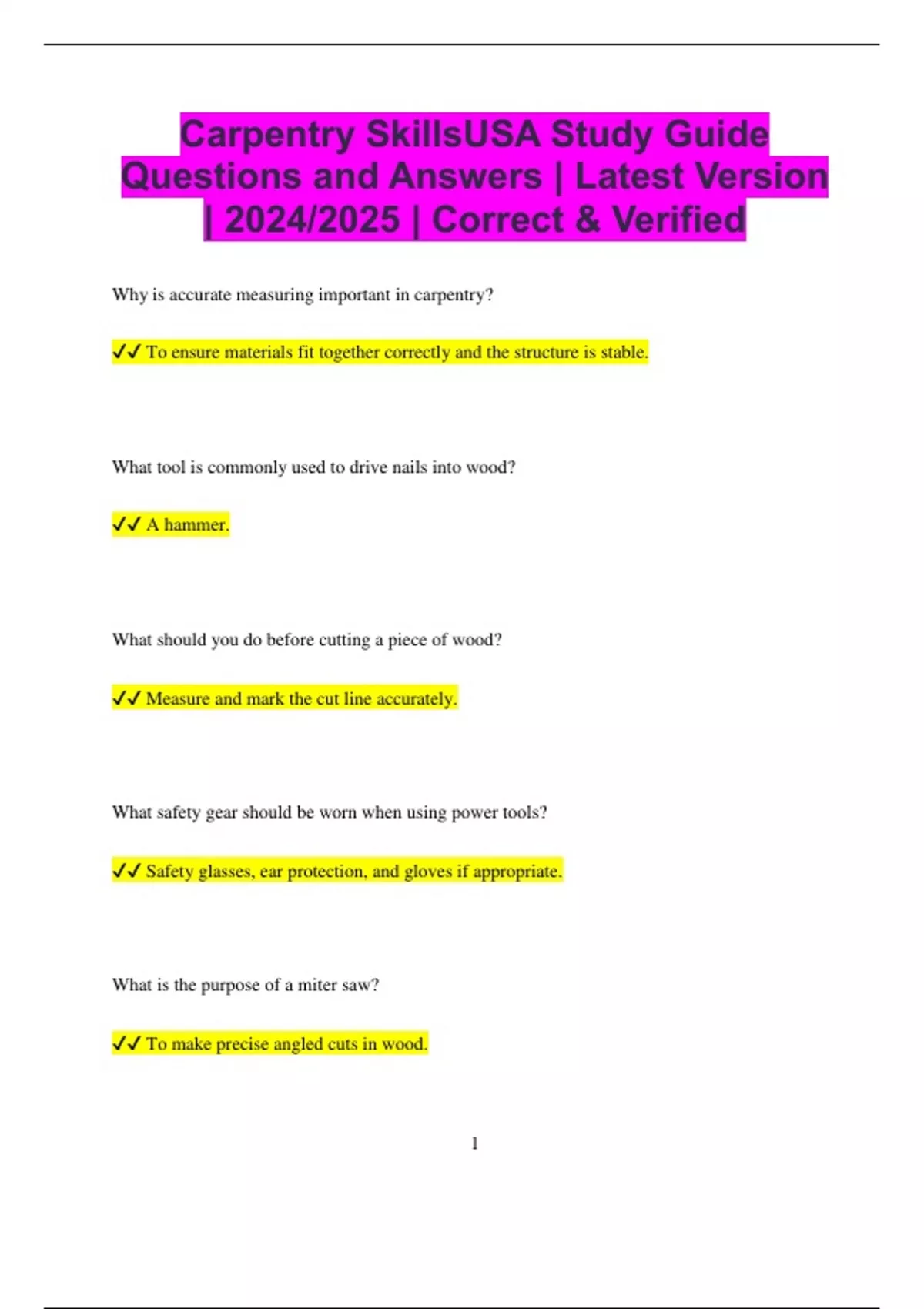 Carpentry SkillsUSA Study Guide Questions and Answers | Latest Version | 2024/2025 | Correct & Verified Why is accurate measuring important in carpentry? To ensure materials fit together correctly and the structure is stable. What tool is commonly used to drive nails into wood? A hammer. What should you do before cutting a piece of wood? Measure and mark the cut line accurately. What safety gear should be worn when using power tools? Safety glasses, ear protection, and gloves if appropriate. What is the purpose of a miter saw? To make precise angled cuts in wood. 2 Why is a square used in carpentry? To check and mark 90-degree angles. What is the primary function of sandpaper in carpentry? To smooth rough surfaces and edges. How do you ensure a nail is driven straight into wood? Hold the nail steady and strike it evenly with the hammer. Why is a tape measure an essential tool for carpentry? To measure materials and spaces accurately. What is the best way to prevent wood from splitting when nailing? Drill pilot holes before driving nails. What should you check before operating a circular saw? Ensure the blade is sharp and properly secured. 3 What is the purpose of using wood glue in carpentry? To create a strong bond between wood pieces. Why is a workbench important in carpentry? It provides a stable surface to work on. What is the function of a coping saw? To cut intricate shapes and curves in wood. Why is proper ventilation important when using wood finishes? To prevent inhaling harmful fumes. What should you do if a power tool cord is damaged? Stop using it and repair or replace the cord immediately. What is the purpose of using a clamp in carpentry? To hold materials securely in place while working. 4 Why is it important to sand wood before applying paint or stain? To ensure a smooth, even finish. What is the primary purpose of a chisel in carpentry? To carve or shape wood by removing small pieces. How do you check if a surface is level?