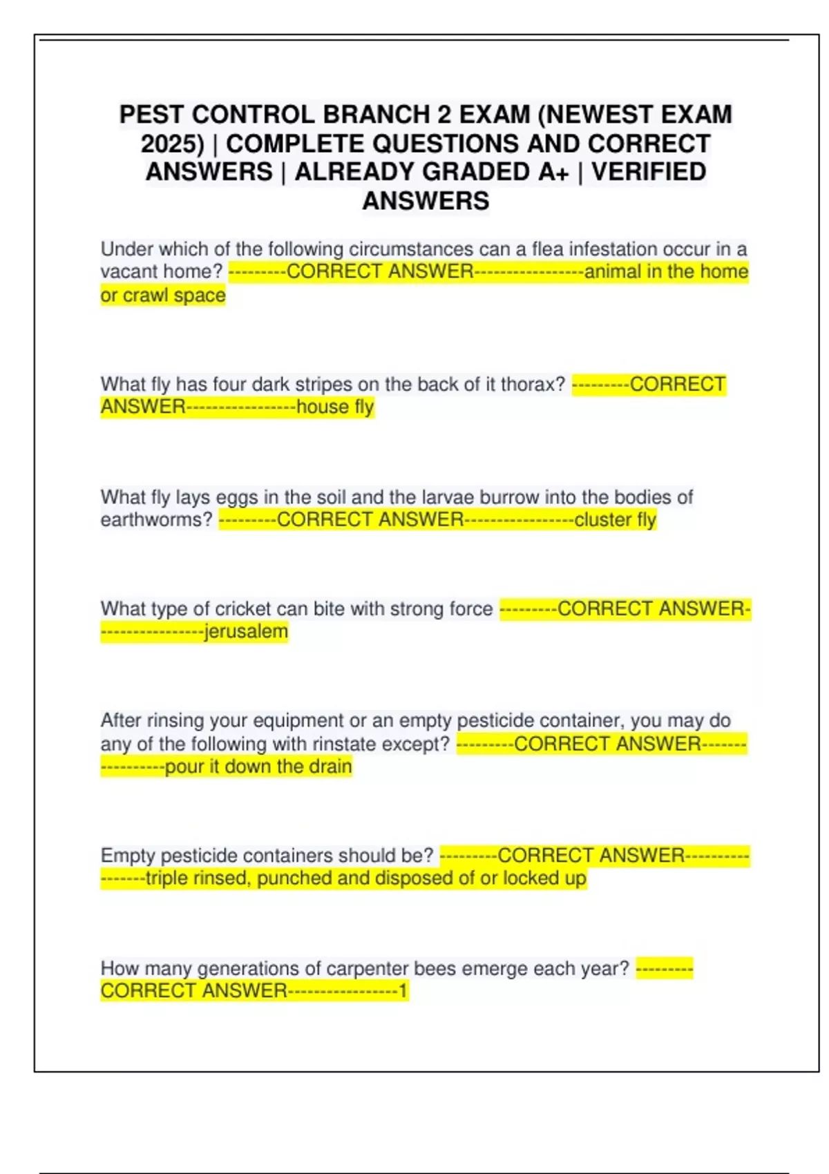 PEST CONTROL BRANCH 2 EXAM (NEWEST EXAM 2025) | COMPLETE QUESTIONS AND CORRECT ANSWERS | ALREADY GRADED A+ | VERIFIED ANSWERS