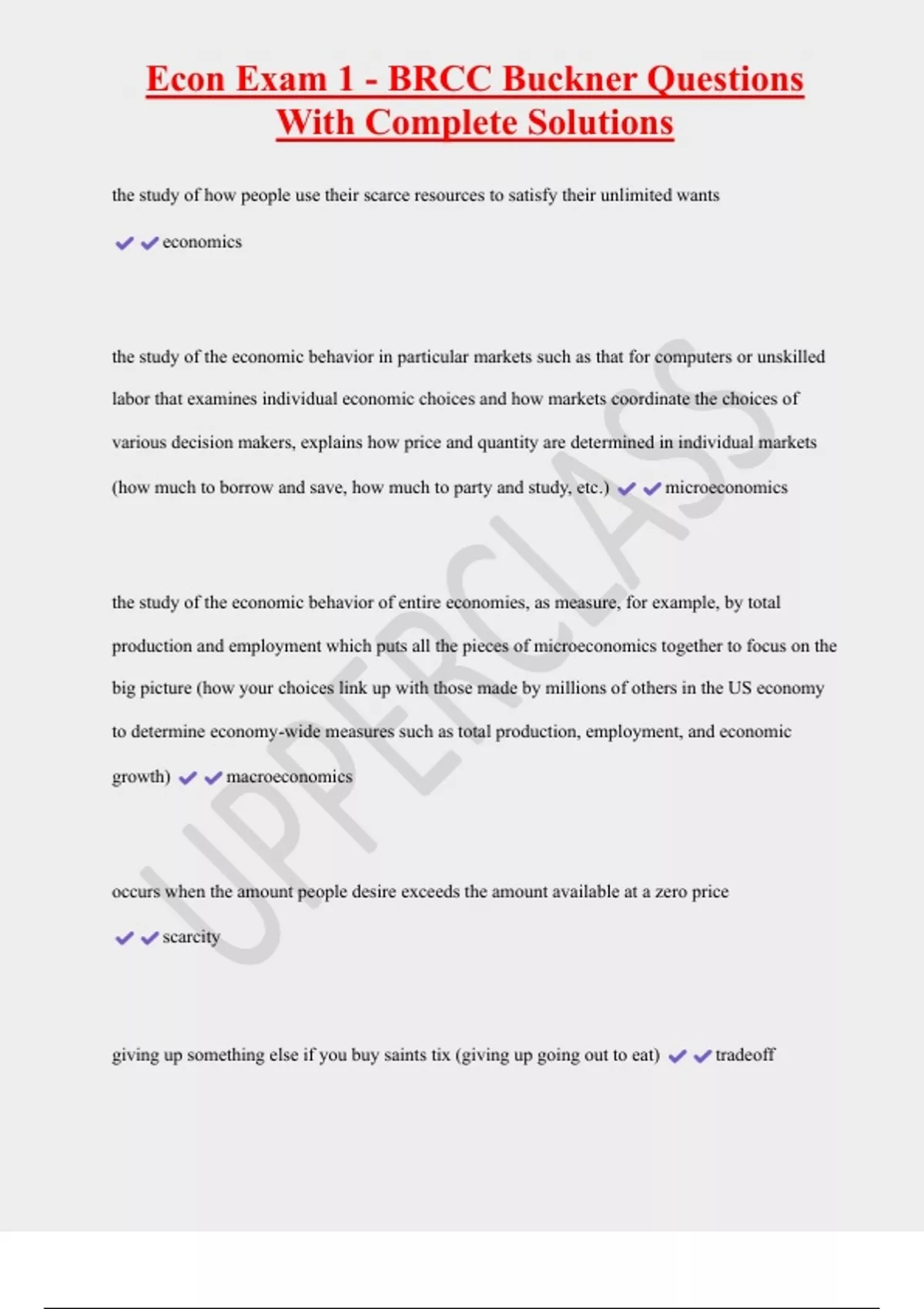 Econ Exam 1 - BRCC Buckner Questions With Complete Solutions the study of how people use their scarce resources to satisfy their unlimited wants economics the study of the economic behavior in particular markets such as that for computers or unskilled labor that examines individual economic choices and how markets coordinate the choices of various decision makers, explains how price and quantity are determined in individual markets (how much to borrow and save, how much to party and study, etc.) microeconomics the study of the economic behavior of entire economies, as measure, for example, by total production and employment which puts all the pieces of microeconomics together to focus on the big picture (how your choices link up with those made by millions of others in the US economy to determine economy-wide measures such as total production, employment, and economic growth) macroeconomics