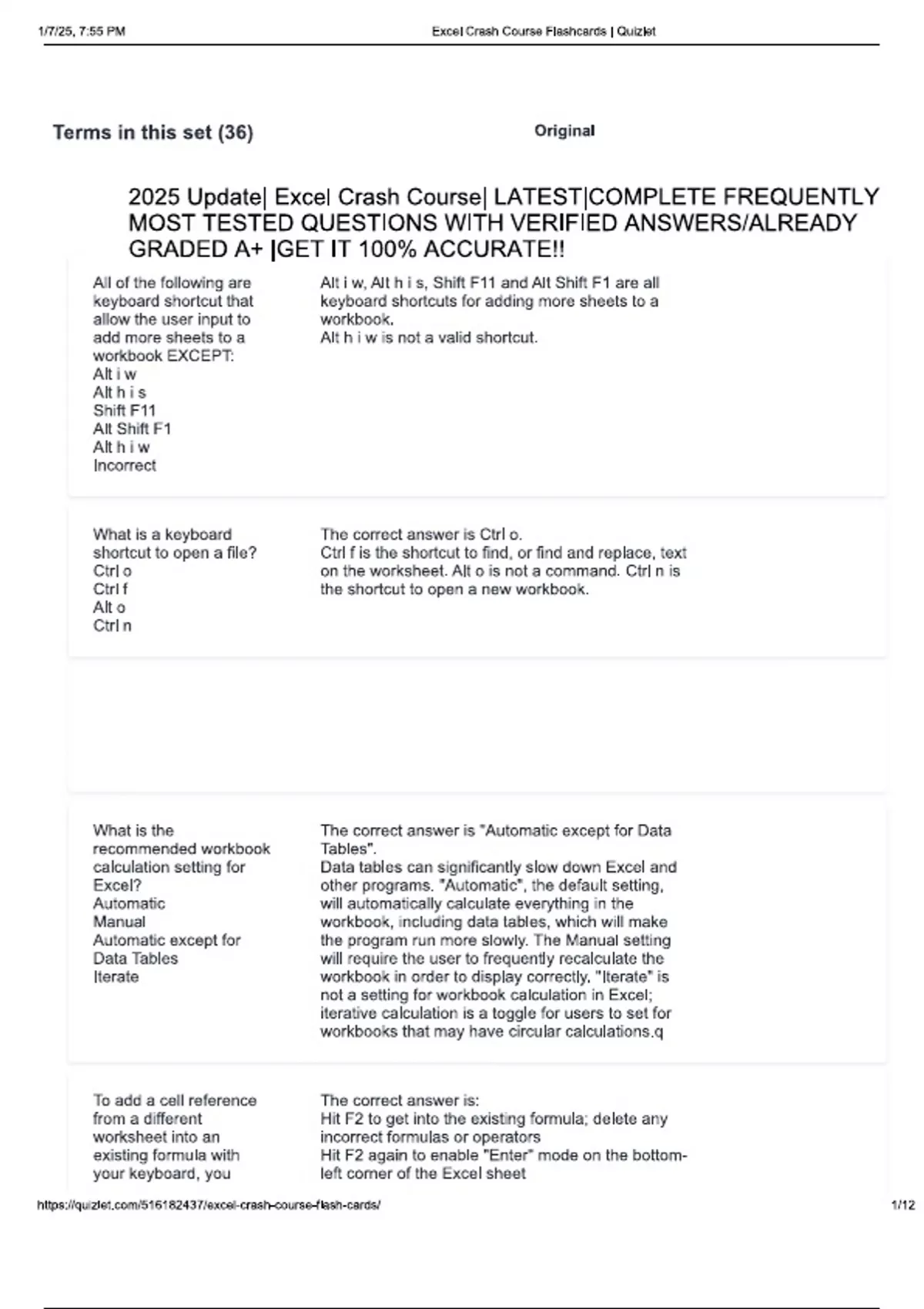 2025 Update| Excel Crash Course| LATEST|COMPLETE FREQUENTLY MOST TESTED QUESTIONS WITH VERIFIED ANSWERS/ALREADY GRADED A+ |GET IT 100% ACCURATE!! All of the following are keyboard shortcut that allow the user input to add more sheets to a workbook EXCEPT: Alt i w Alt h i s Shift F11 Alt Shift F1 Alt h i w Incorrect Alt i w, Alt h i s, Shift F11 and Alt Shift F1 are all keyboard shortcuts for adding more sheets to a workbook. Alt h i w is not a valid shortcut. 2. What is a keyboard shortcut to open a file? Ctrl o Ctrl f Alt o Ctrl n The correct answer is Ctrl o. Ctrl f is the shortcut to find, or find and replace, text on the worksheet. Alt o is not a command. Ctrl n is the shortcut to open a new workbook. 3. What is the recommended workbook calculation setting for Excel? Automatic Manual Automatic except for Data Tables Iterate The correct answer is "Automatic except for Data Tables". Data tables can significantly slow down Excel and other programs. "Automatic", the default setting, will automatically calculate everything in the workbook, including data tables, which will make the program run more slowly. The Manual setting will require the user to frequently recalculate the workbook in order to display correctly. "Iterate" is not a setting for workbook calculation in Excel; iterative calculation is a toggle for users to set for workbooks that may have circular calculations.q 4. To add a cell reference from a different worksheet into an existing formula with The correct answer is: Hit F2 to get into the exist1 / 12 Excel Crash Course Study online at your keyboard, you should follow the following steps: 1. Hit F2 to get into the existing formula; delete any incorrect formulas or operators 2. Hit F2 again to enable "Enter" mode on the bottom-left corner of the Excel sheet 3. Holding down Ctrl, use PageUp or PageDown to find the desired worksheet 4. Let go of the Ctrl and PageUp/Down keys 5. Use the arrow keys to locate the desired cell reference 6. Hit Enter 1. Hit F2 to get into the existing formula; delete any incorrect formulas or operators 2. Hit F2 again to enable "Enter" mode on the bottom-left corner of the Excel sheet 3. Holding down Alt, use PageUp or PageDown to find the desired worksheet 4. Let go of the Ctrl and PageUp/Down keys 5. Use the arrow keys to locate the desired cell reference 6. Hit Escape ing formula; delete any incorrect formulas or operators Hit F2 again to enable "Enter" mode on the bottom-left corner of the Excel sheet Holding down Ctrl, use PageUp or PageDown to find the desired worksheet Let go of the Ctrl and PageUp/Down keys Use the arrow keys to locate the desired cell reference Hit Enter In the incorrect option, 3. Alt Page Up / Down will not allow the user to navigate to a different worksheet; 6. Hit Escape will not save any cell references, but will delete any new data or formula that has been entered into the cell. 5. What is the keyboard command to autofit the row height? Alt o c a Alt o c w Alt h o h Alt h o a The correct answer is "Alt h o a" Alt o c a is used to autofit column width. Alt o c w is used to assign the column width. Alt h o h is used to assign the row height.