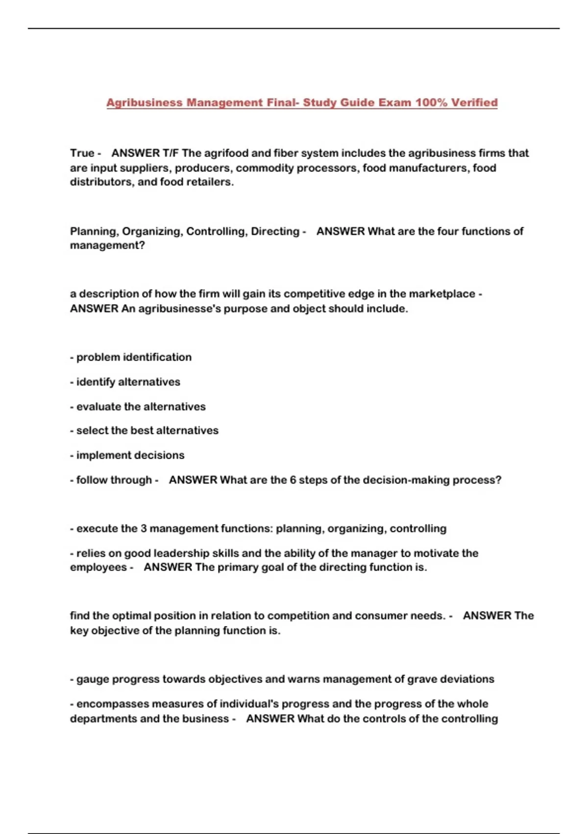 Agribusiness Management Final- Study Guide Exam 100% Verified