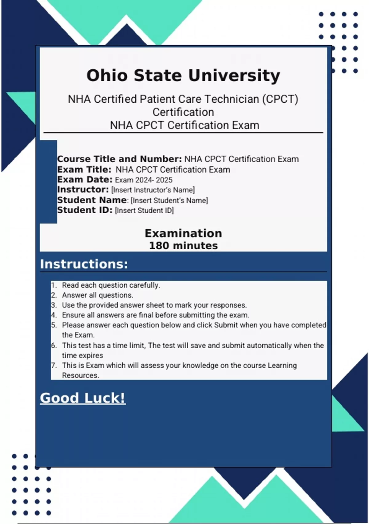 NHA Certified Patient Care Technician (CPCT) Certification NHA CPCT Exam Chapter 1 Patient Care Review Questions with Correct Answers | 100% Pass Guaranteed | Graded A+ |