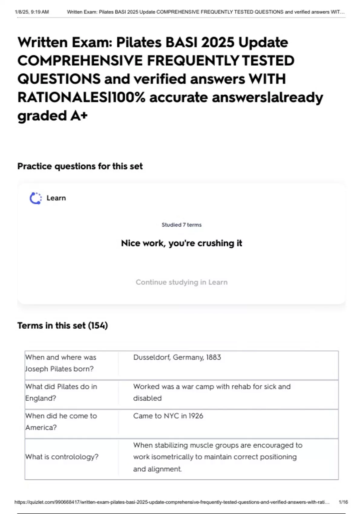 , 1/8/25, 9:19 AM Written Exam: Pilates BASI 2025 Update COMPREHENSIVE FREQUENTLY TESTED QUESTIONS and verified answers WIT…