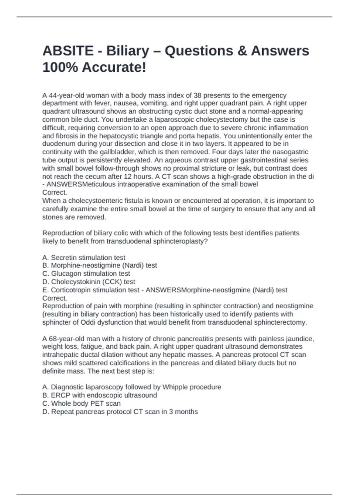 ABSITE - Biliary – Questions & Answers 100% Accurate!