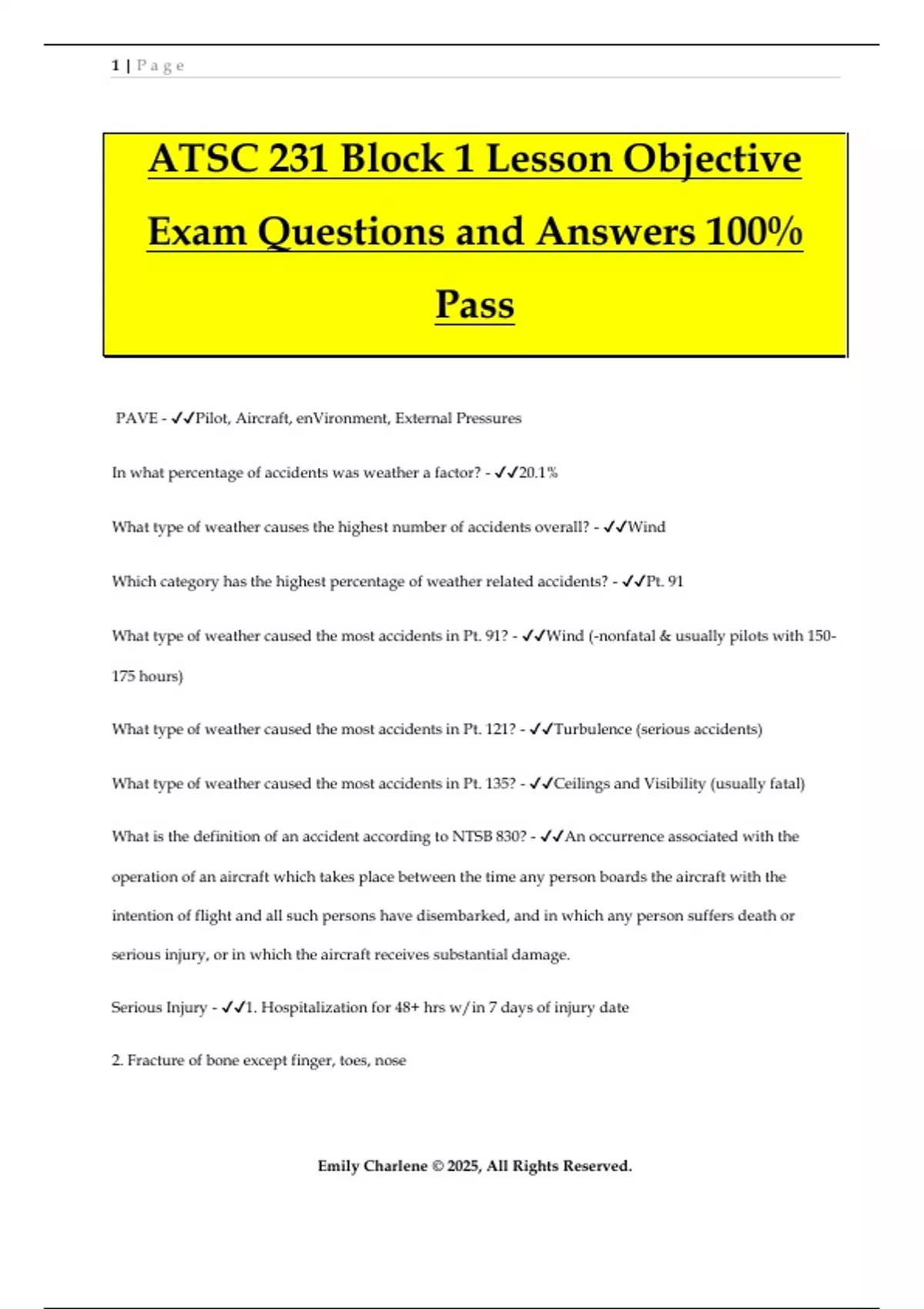 ATSC 231 Block 1 Lesson Objective Exam Questions and Answers 100% Pass PAVE - Pilot, Aircraft, enVironment, External Pressures In what percentage of accidents was weather a factor? - 20.1% What type of weather causes the highest number of accidents overall? - Wind Which category has the highest percentage of weather related accidents? - Pt. 91 What type of weather caused the most accidents in Pt. 91? - Wind (-nonfatal & usually pilots with 150- 175 hours) What type of weather caused the most accidents in Pt. 121? - Turbulence (serious accidents) What type of weather caused the most accidents in Pt. 135? - Ceilings and Visibility (usually fatal) What is the definition of an accident according to NTSB 830? - An occurrence associated with the operation of an aircraft which takes place between the time any person boards the aircraft with the intention of flight and all such persons have disembarked, and in which any person suffers death or serious injury, or in which the aircraft receives substantial damage. Serious Injury - 1. Hospitalization for 48+ hrs w/in 7 days of injury date 2. Fracture of bone except finger, toes, nose 2 | P a g e Emily Charlene © 2025, All Rights Reserved. 3. Severe hemorrhages, nerve, muscle, tendon damage 4. Involves any internal organ 5. 2nd or 3rd degree burns or burns covering 5% of body surface What is pilot error? - The pilot is considered to be principally or partially responsible, 80% of accidents What is CRM? - A management system which makes optimum use of all available resources - equipment, procedures and people - to promote safety and enhance the efficiency of flight operations What is risk management? - Proactively identify safety related hazards and mitigate the associated risks What is ADM? - A systematic approach to the mental process used by aircraft pilots to consistently determine the best course of action in response to a given set of circumstances What are some ADM models? - 5Ps, 3Ps, DECIDE, OODA NOAA (National Oceanic & Atmospheric Administration) - To understand and predict changes in Earth's environment and conserve and manage coastal and marine resources to meet our Nation's economic, social, and environmental needs NESDIS (National Environmental Satellite, Data, and Information Service.) - Provides timely access to global environmental data from satellites and other sources to promote, protect, & enhance the Nation's economy, security, environment, & quality of life SAB (Satellite Analysis Branch) - Operational focal point for real time imagery products and multi- disciplinary environmental analysis, supports disaster mitigation and warning services for US agencies, schedules and distributes real time satellite imagery 3 | P a g e Emily Charlene © 2025, All Rights Reserved. NWS (National Weather Service) - Provides weather data, forecasts and warnings for the protection of life and property and provides national information data base NCEP (National Center for Environmental Prediction) - All global meteorological data is collected and analyzed, provides a wide variety of national and international weather guidance products to everyone. 9 Specialized Centers for Analyzing and Forecasting SPC (Storm Prediction Center) - Provides tornado and severe weather watches for the contiguous United States AWC (Aviation Weather Center) - Issues a suite of aviation weather forecasts in support of the National Airspace System NHC (National Hurricane Center) - Provides official NWS forecasts of the movement and strength of tropical weather systems, issues appropriate watches and warnings for the contiguous US and surrounding areas NCO (NCEP Central Operations) - Sustains and executes the operational suite of the numerical analysis and forecast models, prepares NCEP products for dissemination, links all 9 NCEP centers together via computer and communications-related services WPC (Weather Prediction Center) - Provides analysis and forecas