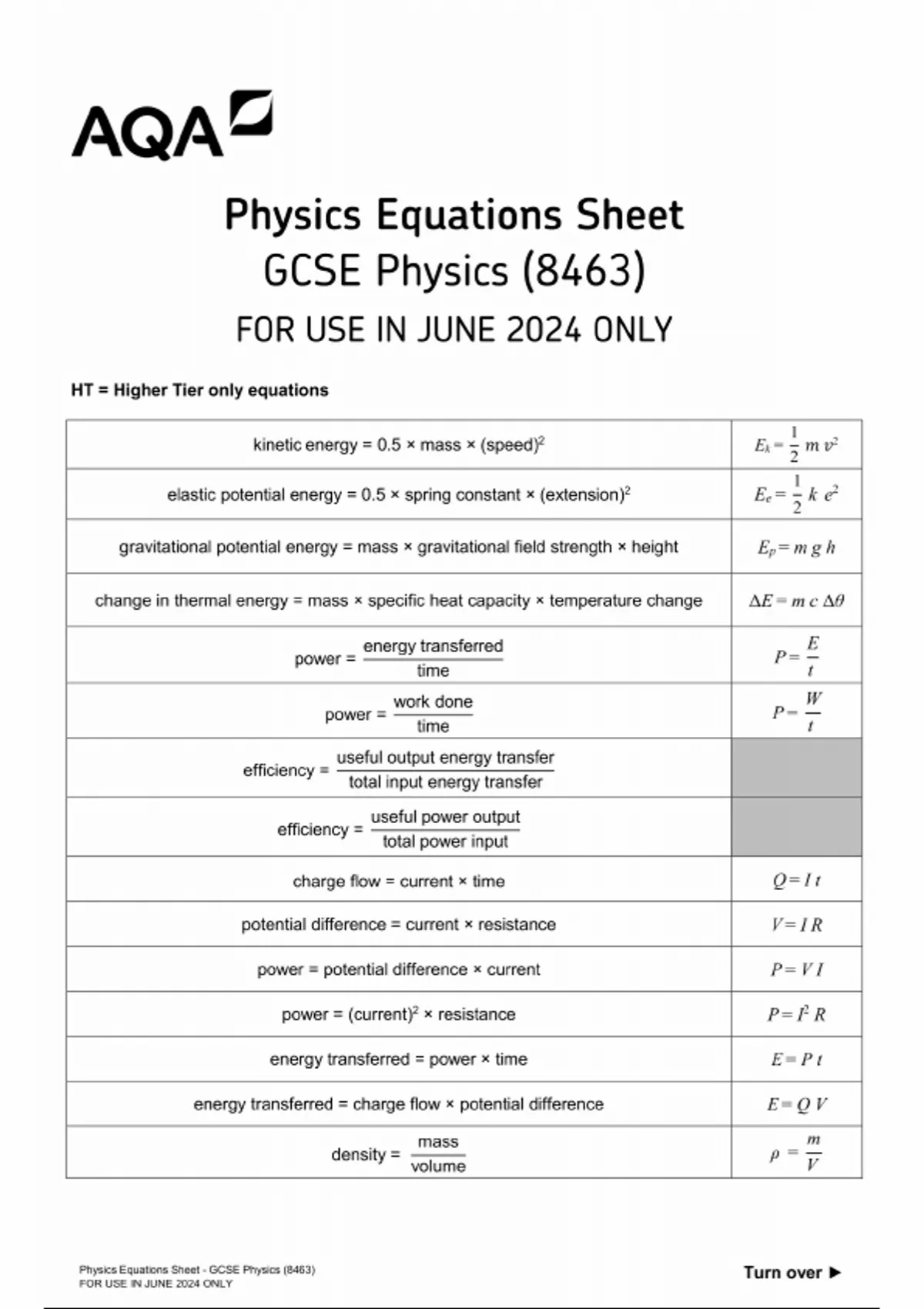 AQA GCSE PHYSICS EQUATION SHEET INSERT 2024