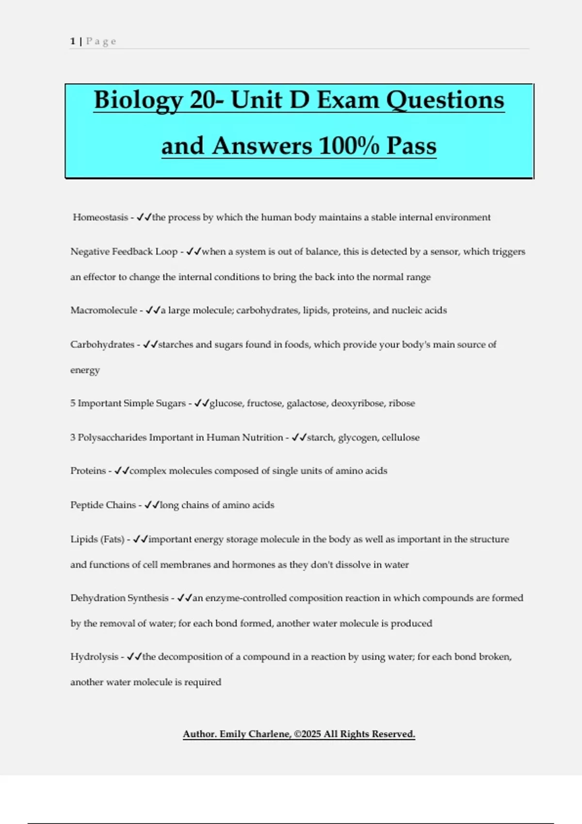 Biology 20- Unit D Exam Questions and Answers 100% Pass Homeostasis - the process by which the human body maintains a stable internal environment Negative Feedback Loop - when a system is out of balance, this is detected by a sensor, which triggers an effector to change the internal conditions to bring the back into the normal range Macromolecule - a large molecule; carbohydrates, lipids, proteins, and nucleic acids Carbohydrates - starches and sugars found in foods, which provide your body's main source of energy 5 Important Simple Sugars - glucose, fructose, galactose, deoxyribose, ribose 3 Polysaccharides Important in Human Nutrition - starch, glycogen, cellulose Proteins - complex molecules composed of single units of amino acids Peptide Chains - long chains of amino acids Lipids (Fats) - important energy storage molecule in the body as well as important in the structure and functions of cell membranes and hormones as they don't dissolve in water Dehydration Synthesis - an enzyme-controlled composition reaction in which compounds are formed by the removal of water; for each bond formed, another water molecule is produced Hydrolysis - the decomposition of a compound in a reaction by using water; for each bond broken, another water molecule is required 2 | P a g e Author. Emily Charlene, ©2025 All Rights Reserved. Enzymes - specific types of proteins that help regulate the many different chemical reactions that occur in your body; proteins that speed up or catalyze chemical reaction Catalyze - to increase the rate of reaction Substrate Molecule - a molecule that an enzyme interacts with chemically Feedback Inhibition - the process by which the accumulated end product of a biochemical pathway stops the synthesis of that product Environmental Conditions that Cause an Enzyme to Stop Functioning Properly - - denatured by heat - denatured by low pH - temperature is too low Physical Digestion - Breaking food down into smaller pieces Chemical Digestion - the process of breaking down large macromolecules into their subunits by enzymes Digestion in the Mouth - physical breakdown of food by chewing, chemical breakdown of starch by salivary amylase Sphincter - a ringlike muscular structure that normally m