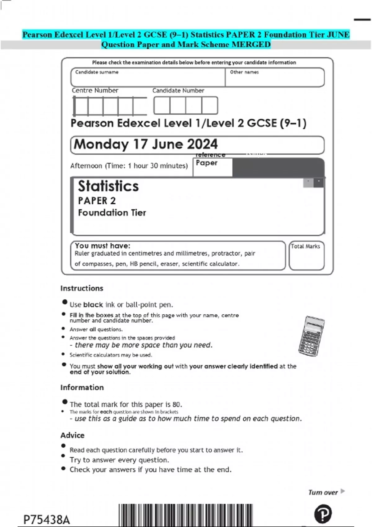 Pearson Edexcel Level 1/Level 2 GCSE (9–1) Statistics PAPER 2 Foundation Tier JUNE Question Paper and Mark Scheme MERGED