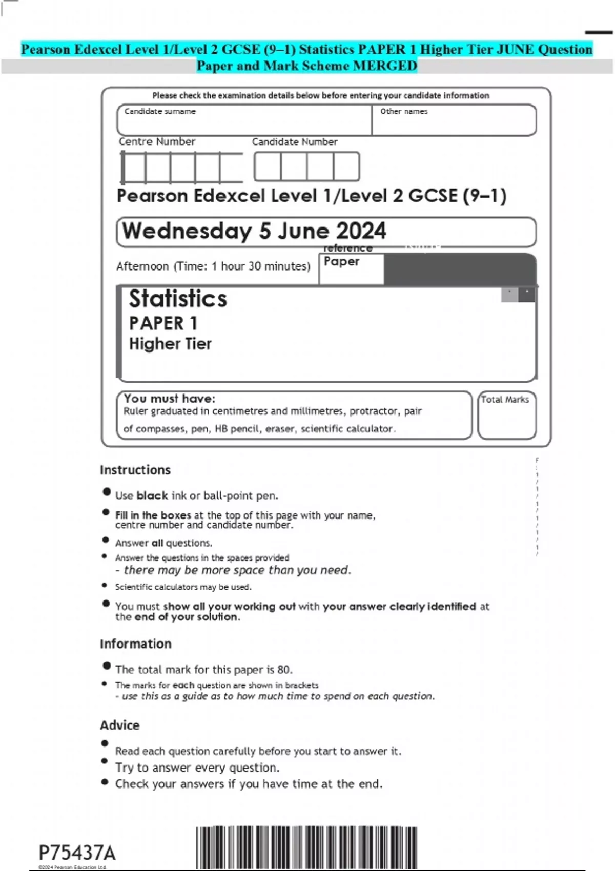 Pearson Edexcel Level 1/Level 2 GCSE (9–1) Statistics PAPER 1 Higher Tier JUNE Question Paper and Mark Scheme MERGED