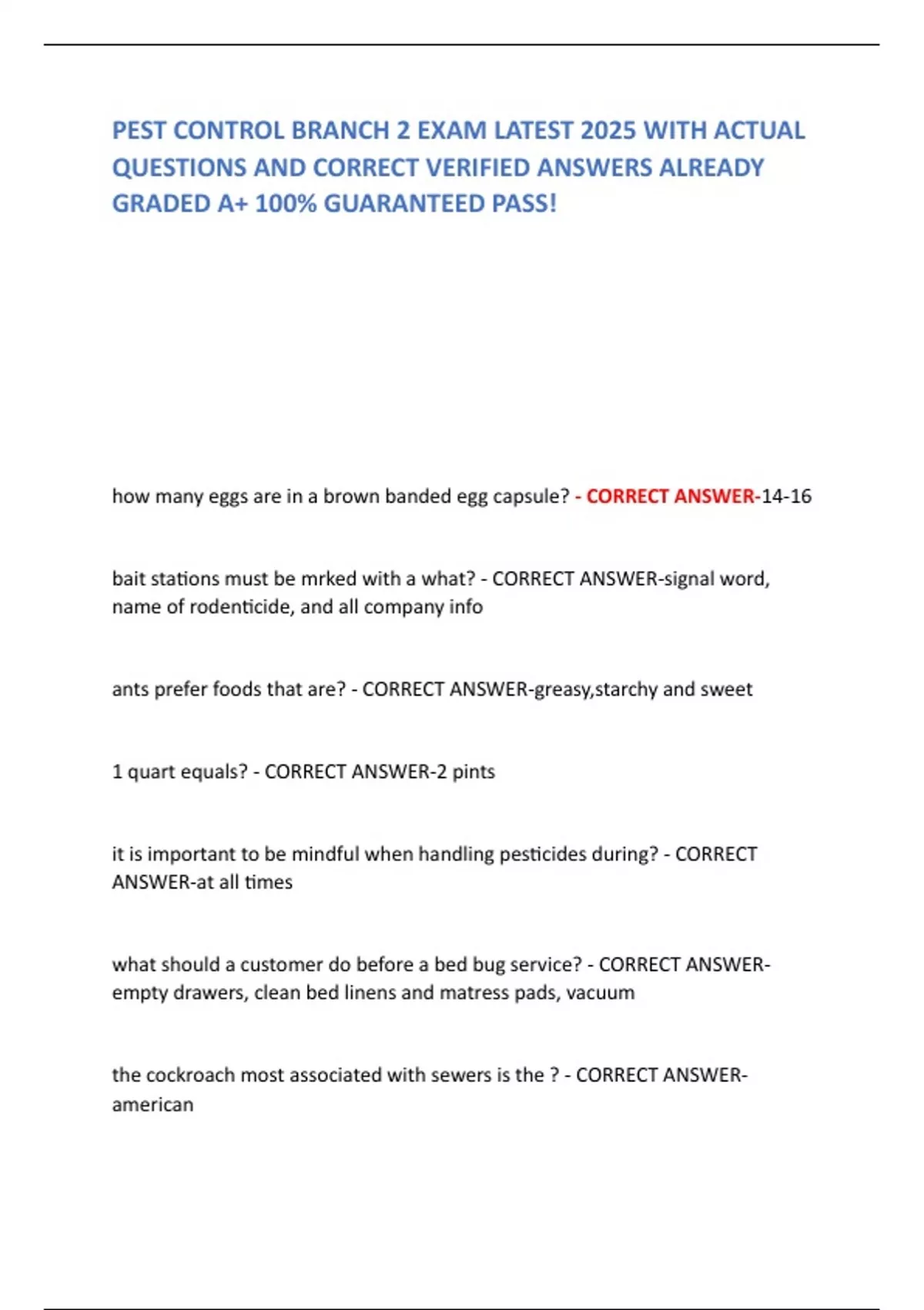 PEST CONTROL BRANCH 2 EXAM LATEST 2025 WITH ACTUAL QUESTIONS AND CORRECT VERIFIED ANSWERS ALREADY GRADED A+ 100% GUARANTEED PASS!