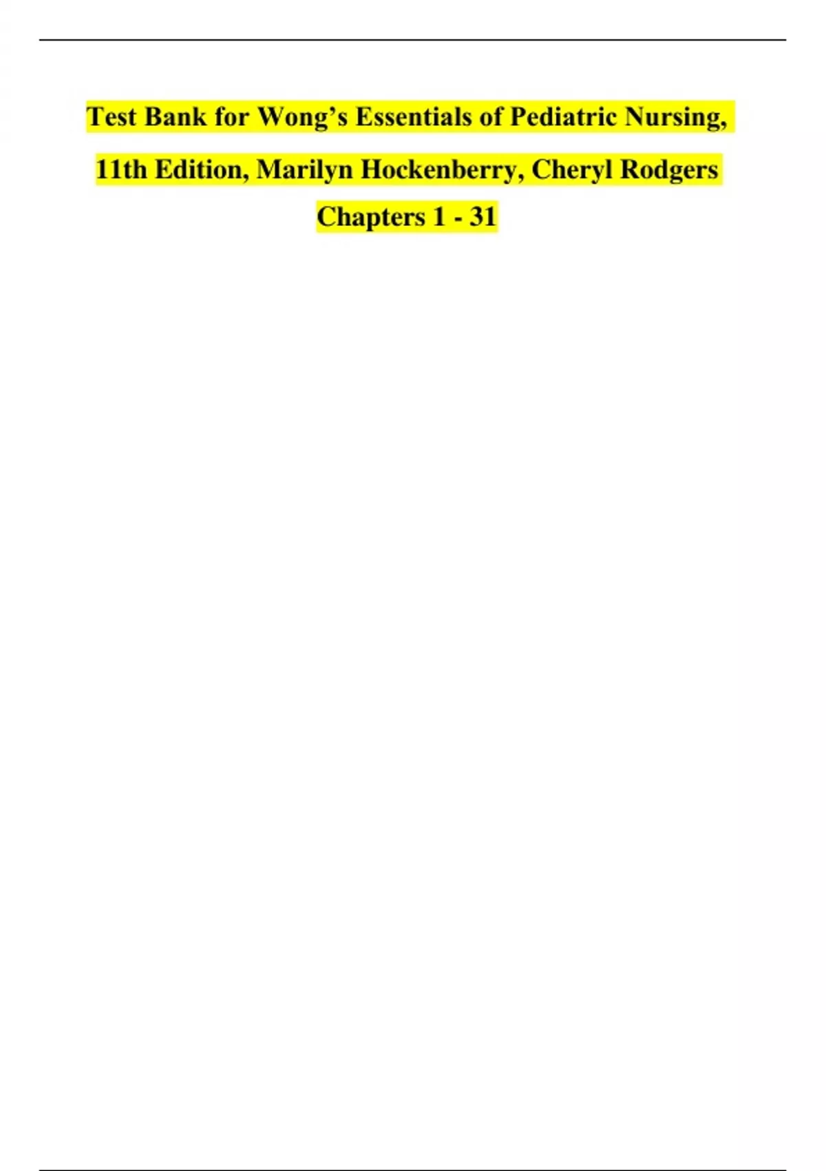 The Test Bank for Wong’s Essentials of Pediatric Nursing, 11th Edition by Marilyn Hockenberry and Cheryl Rodgers offers a detailed collection of exam-style questions to support nursing students and educators in mastering pediatric nursing concepts. This test bank includes multiple-choice, true/false, and critical thinking questions that cover growth and development, pediatric disease processes, family-centered care, health promotion, and evidence-based interventions. Each question is structured to reflect real-world clinical scenarios and current pediatric practice, helping students strengthen their clinical reasoning, decision-making, and exam readiness, including preparation for the NCLEX®. Perfect for both exam preparation and classroom use, this test bank provides a reliable and thorough tool to enhance understanding and application of pediatric nursing knowledge.