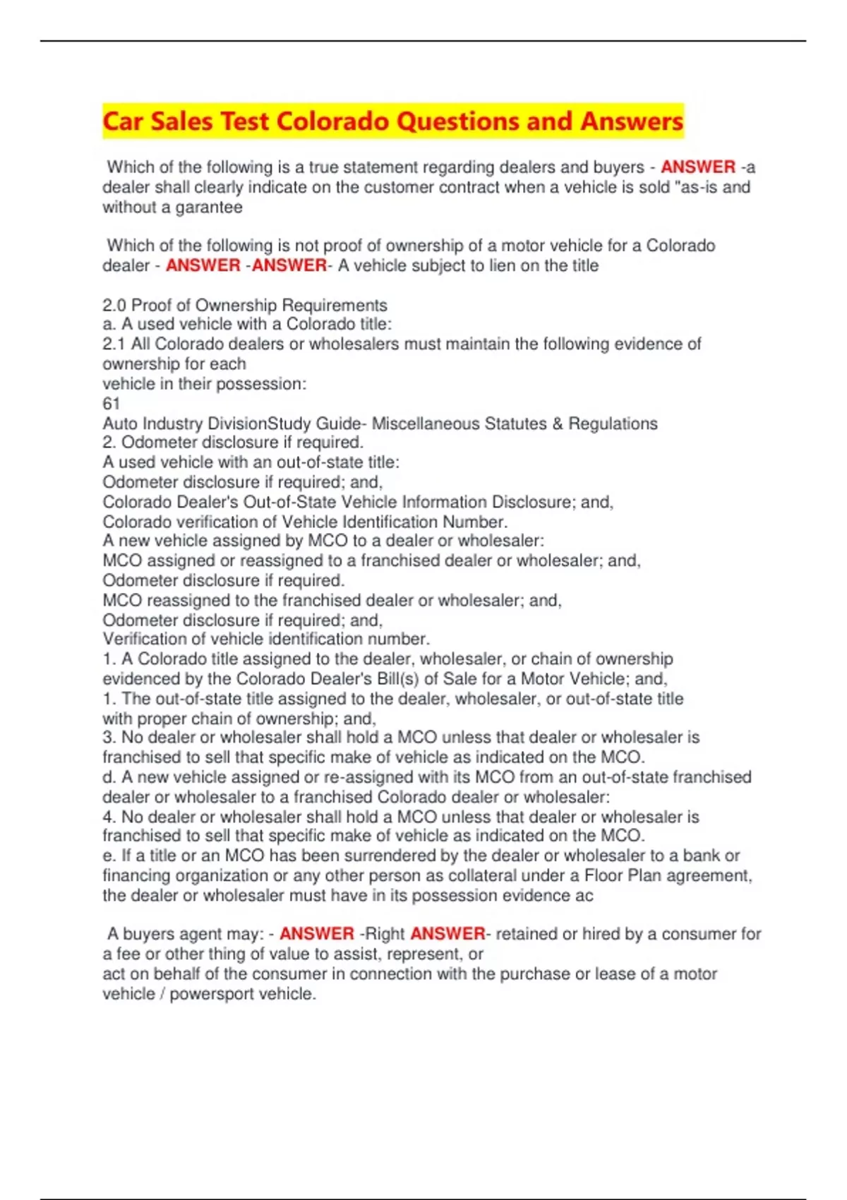 Car Sales Test Colorado Questions and Answers Which of the following is a true statement regarding dealers and buyers - ANSWER -a dealer shall clearly indicate on the customer contract when a vehicle is sold "as-is and without a garantee Which of the following is not proof of ownership of a motor vehicle for a Colorado dealer - ANSWER -ANSWER- A vehicle subject to lien on the title 2.0 Proof of Ownership Requirements a. A used vehicle with a Colorado title: 2.1 All Colorado dealers or wholesalers must maintain the following evidence of ownership for each vehicle in their possession: 61 Auto Industry DivisionStudy Guide- Miscellaneous Statutes & Regulations 2. Odometer disclosure if required. A used vehicle with an out-of-state title: Odometer disclosure if required; and, Colorado Dealer's Out-of-State Vehicle Information Disclosure; and, Colorado verification of Vehicle Identification Number. A new vehicle assigned by MCO to a dealer or wholesaler: MCO assigned or reassigned to a franchised dealer or wholesaler; and, Odometer disclosure if required. MCO reassigned to the franchised dealer or wholesaler; and, Odometer disclosure if required; and, Verification of vehicle identification number. 1. A Colorado title assigned to the dealer, wholesaler, or chain of ownership evidenced by the Colorado Dealer's Bill(s) of Sale for a Motor Vehicle; and, 1. The out-of-state title assigned to the dealer, wholesaler, or out-of-state title with proper chain of ownership; and, 3. No dealer or wholesaler shall hold a MCO unless that dealer or wholesaler is franchised to sell that specific make of vehicle as indicated on the MCO. d. A new vehicle assigned or re-assigned with its MCO from an out-of-state franchised dealer or wholesaler to a franchised Colorado dealer or wholesaler: 4. No dealer or wholesaler shall hold a MCO unless that dealer or wholesaler is franchised to sell that specific make of vehicle as indicated on the MCO. e. If a title or an MCO has been surrendered by the dealer or wholesaler to a bank or financing organization or any other person as collateral under a Floor Plan agreement, the dealer or wholesaler must have in its possession evidence ac A buyers agent may: - ANSWER -Right ANSWER- retained or hired by a consumer for a fee or other thing of value to assist, represent, or act on behalf of the consumer in connection with the purchase or lease of a motor vehicle / powersport vehicle. Wrong ANSWERs---------- -intentionally enter into a financial agreement with a motor vehicle salesperson for the buyer's agent benefit -be employed by a dealer or salesperson -coerce a motor vehicle dealer into providing installment financing with specified financial institution Found in---------------------------------------- "Buyer agent" means any person required to be licensed pursuant to this part 1 who is retained or hired by a consumer for a fee or other thing of value to assist, represent, or act on behalf of the consumer in connection with the purchase or lease of a motor vehicle. Motor vehicle and power sports salesperson are required to have a surety bond in the amount of - ANSWER -15,000 Motor vehicle salesperson's bond (1) Before any motor vehicle salesperson's license is issued by the board through the executive director to any applicant therefor, the applicant shall procure and file with the board evidence of a savings account, deposit, or certificate of deposit meeting the requirements of section 11- 35-101, C.R.S., or a good and sufficient bond in the amount of fifteen thousand dollar If there are no remaining reassignments on the back of the title the dealer can complete a Statement of Fact to reassign the title. - ANSWER -Cannot find in study guides or online... educated guess. False? - ANSWER -"used motor vehicle" is defined as any motor vehicle which has been sold, bargained, exchanged, given away, or the title thereto transferred from the person who first took title thereto from the manufacturer or importer, dealer or agent of the manufacturer or importer, or so used as to have become what is commonly known as a "secondhand motor vehicle"." In the event of transfer on the certificate of origin, from the original franchised dealer to any other dealer or individual other than a franchised dealer of the same make of vehicle, the vehicle shall be considered a "used" motor vehicle, and must be titled in the new owner's name. Vehicles with more Than Fifteen Hundred (1500) miles of demonstration use shall be considered used' vehicles. Such "demonstrators" and other motor vehicles 3 Auto Industry DivisionStudy Guide- Motor Vehicle Regulations REGULATION 12-6-102(13) which have been used by a dealer prior to their sale shall be titled in the dealer's name and sold as "used" motor vehicles. an off premises permit: - ANSWER -Right ANSWER- must be readily available for inspection at the sale motor vehicle dealer may sell motor vehicles at special sales events, shows, or other organized events, including, for example, at the National Western Stock Show, the Colorado State Fair, the Greeley Stampede, or the Denver Auto Show. In order to sell motor vehicles at a location away from the dealership, a motor vehicle dealer must apply for the appropriate off-premise permit. A motor vehicle dealer must not engage in any sales activity at an off-premise location until the board approves the appropriate off-premise permit. The board recognizes two classes of off-premise permit based upon specific salesrelated conditions and restrictions. These are: Class One --- a Limited Sales Activity Off-premise Permit. The following conditions and restrictions apply to this permit: Licensed salespersons or owners authorized to sell must be present at the offpremise location at all times when the public is present; and, Licensed salespersons or owners authorized to sell may negotiate the terms of a sale at the off-premise location; and, 4 3) b.1) 2) Auto Industry DivisionStudy Guide- Motor Vehicle Regulations The pa