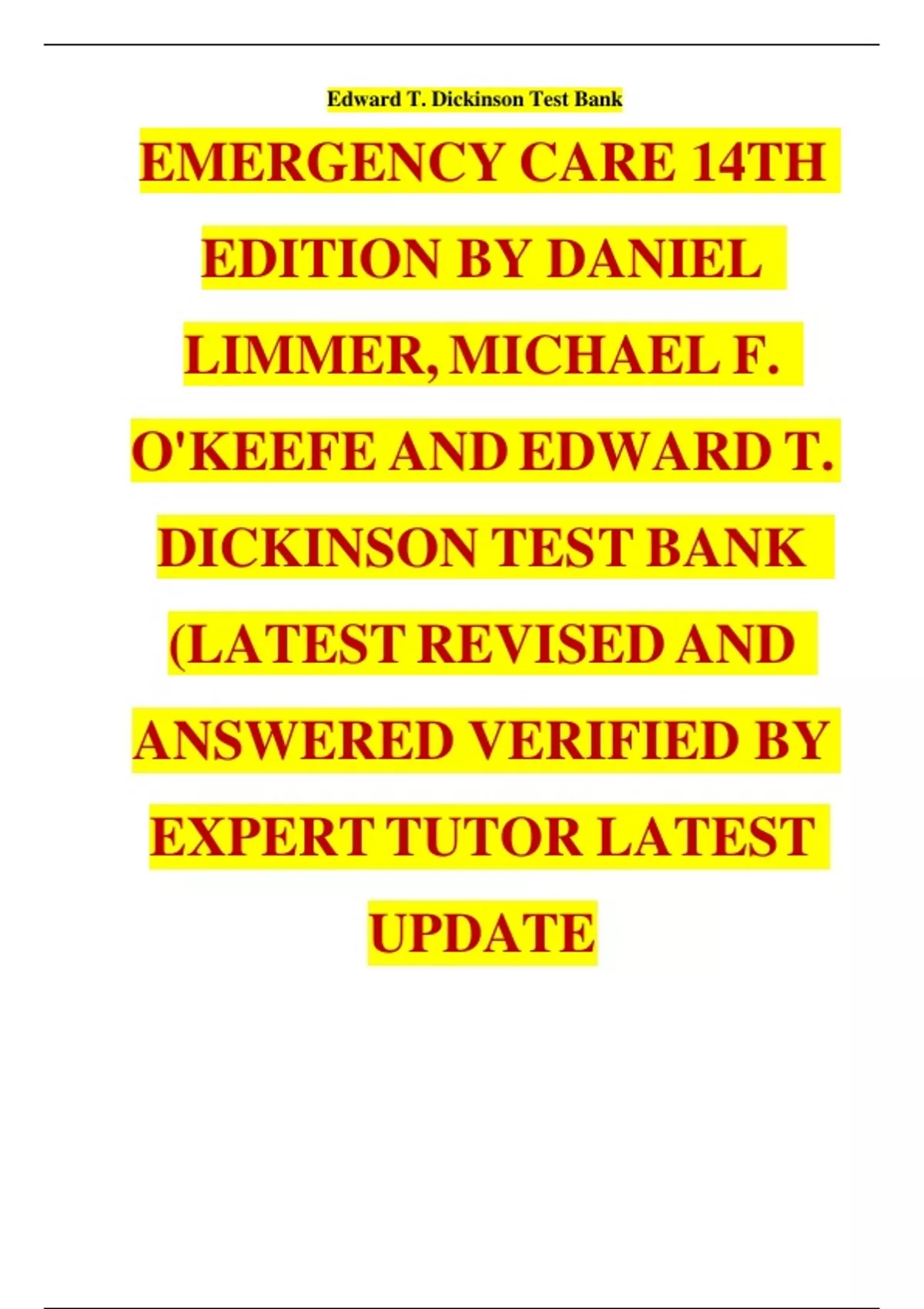 EMERGENCY CARE 14TH EDITION BY DANIEL LIMMER, MICHAEL F. O-KEEFE AND EDWARD T. DICKINSON TEST BANK (LATEST REVISED AND ANSWERED VERIFIED BY EXPERT TUTOR LATEST UPDATE .