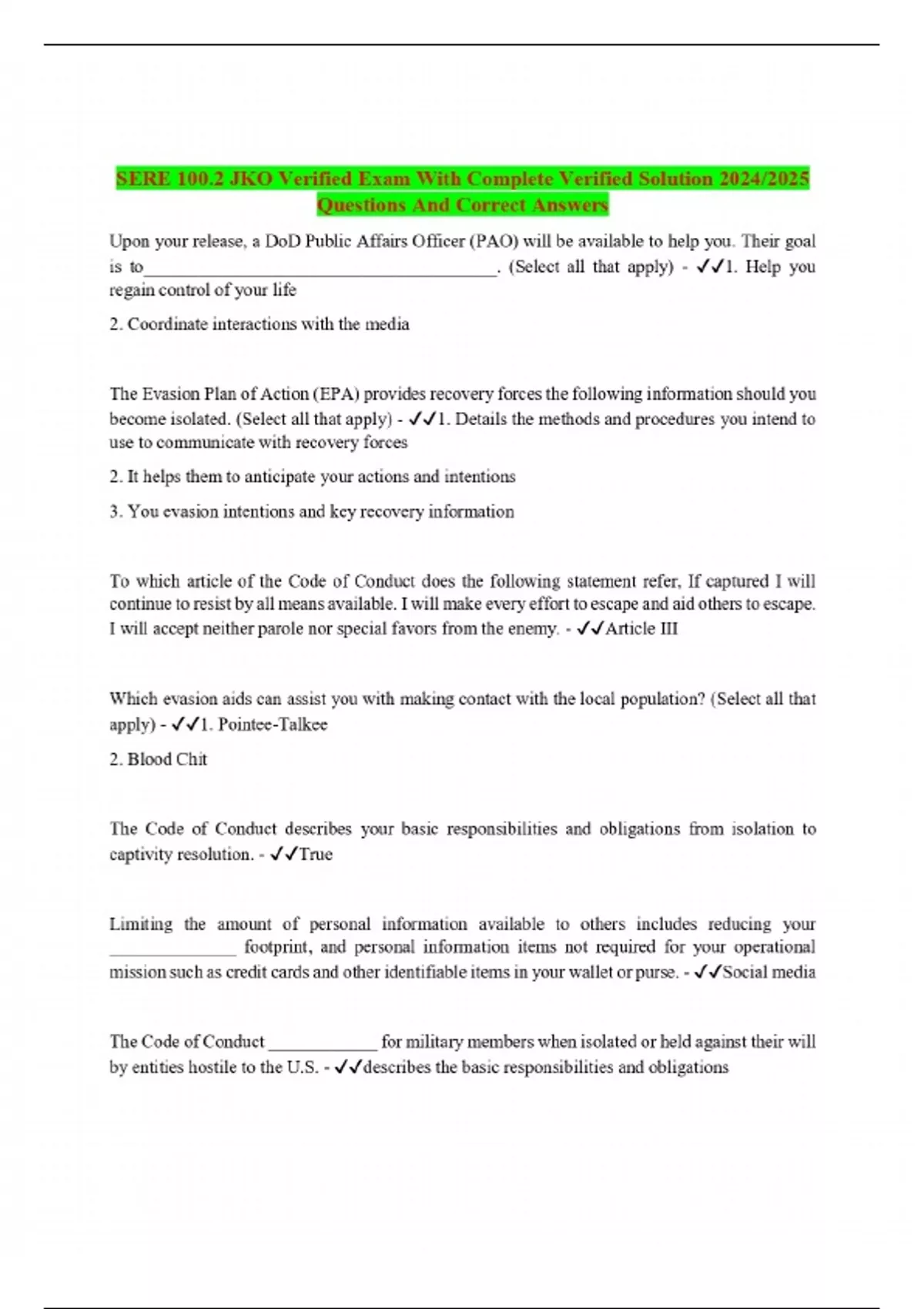 SERE 100.2 JKO Verified Exam With Complete Verified Solution 2024/2025 Questions And Correct Answers