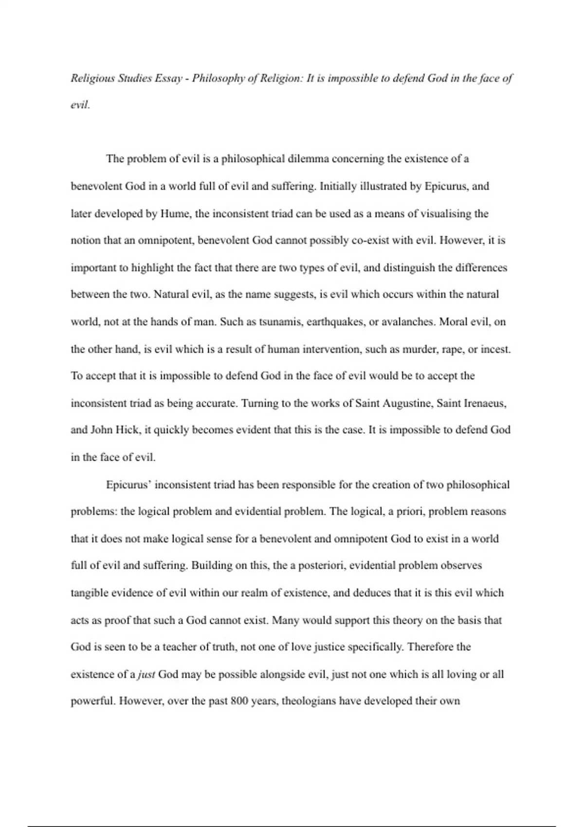An A* philosophy of religion essay titled 'it is impossible to defend God in the face of evil'. It covers Augustine and Irenaeus' theodicies, as well as Hick's counterfactual thesis and both the logical and evidential problems.
