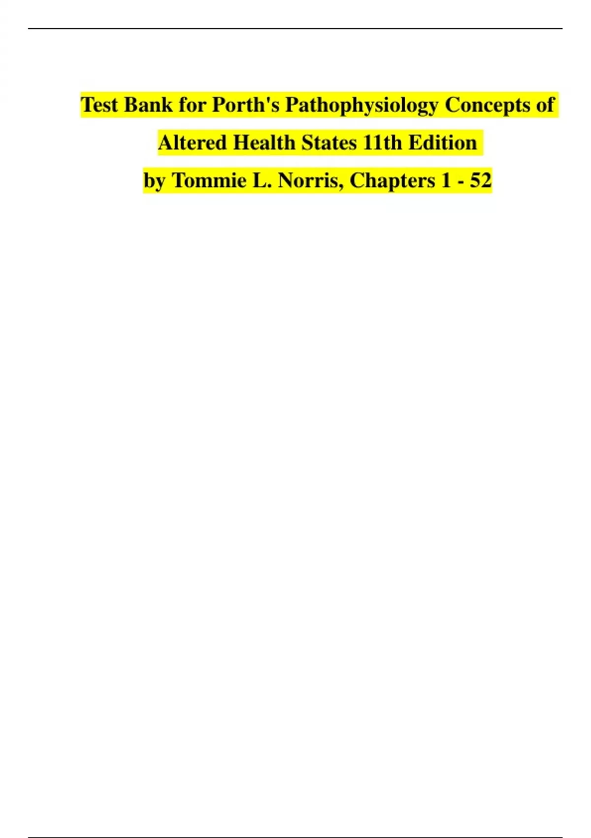 Instant Download Available After Purchase. If you experience any issues downloading the file, simply message me — I’ll send it instantly via Google Drive or email. This is the official, complete Test Bank for Porth’s Pathophysiology: Concepts of Altered Health States, 11th Edition by Tommie L. Norris — fully updated and verified. This resource provides high-quality exam-level questions and accurate answers designed to reflect the latest edition’s structure and clinical relevance. Built to support nursing, medical, and health science students, this test bank allows you to assess and strengthen your understanding of key disease processes, clinical manifestations, and the body’s physiological responses. Whether you're preparing for quizzes, unit exams, or major finals, this tool is designed to reinforce critical thinking and application in real-world care situations. The questions are carefully aligned with current evidence-based practice and offer a challenging, clinically focused way to prepare for exams — including NCLEX, ATI, HESI, and graduate-level assessments. ️ GRADED A+ | Trusted by students, instructors, and tutors ️ Updated for the 11th edition (Latest) ️ Ideal for self-study, exam prep, or classroom support