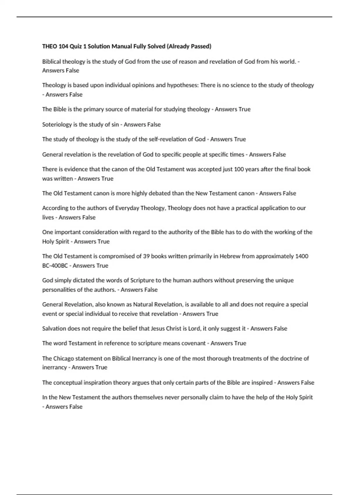 THEO 104 Quiz 1 Solution Manual Fully Solved (Already Passed) Biblical theology is the study of God from the use of reason and revelation of God from his world. - Answers False Theology is based upon individual opinions and hypotheses: There is no science to the study of theology - Answers False The Bible is the primary source of material for studying theology - Answers True Soteriology is the study of sin - Answers False The study of theology is the study of the self-revelation of God - Answers True General revelation is the revelation of God to specific people at specific times - Answers False There is evidence that the canon of the Old Testament was accepted just 100 years after the final book was written - Answers True The Old Testament canon is more highly debated than the New Testament canon - Answers False According to the authors of Everyday Theology, Theology does not have a practical application to our lives - Answers False One important consideration with regard to the authority of the Bible has to do with the working of the Holy Spirit - Answers True The Old Testament is compromised of 39 books written primarily in Hebrew from approximately 1400 BC-400BC - Answers True God simply dictated the words of Scripture to the human authors without preserving the unique personalities of the authors. - Answers False General Revelation, also known as Natural Revelation, is available to all and does not require a special event or special individual to receive that revelation - Answers True Salvation does not require the belief that Jesus Christ is Lord, it only suggest it - Answers False The word Testament in reference to scripture means covenant - Answers True