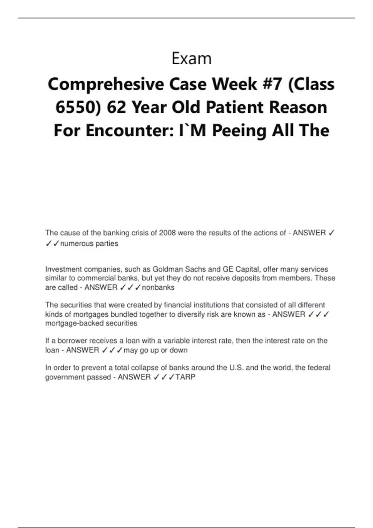 The cause of the banking crisis of 2008 were the results of the actions of - ANSWER numerous parties Investment companies, such as Goldman Sachs and GE Capital, offer many services similar to commercial banks, but yet they do not receive deposits from members. These are called - ANSWER nonbanks The securities that were created by financial institutions that consisted of all different kinds of mortgages bundled together to diversify risk are known as - ANSWER mortgage-backed securities If a borrower receives a loan with a variable interest rate, then the interest rate on the loan - ANSWER may go up or down In order to prevent a total collapse of banks around the U.S. and the world, the federal government passed - ANSWER TAR