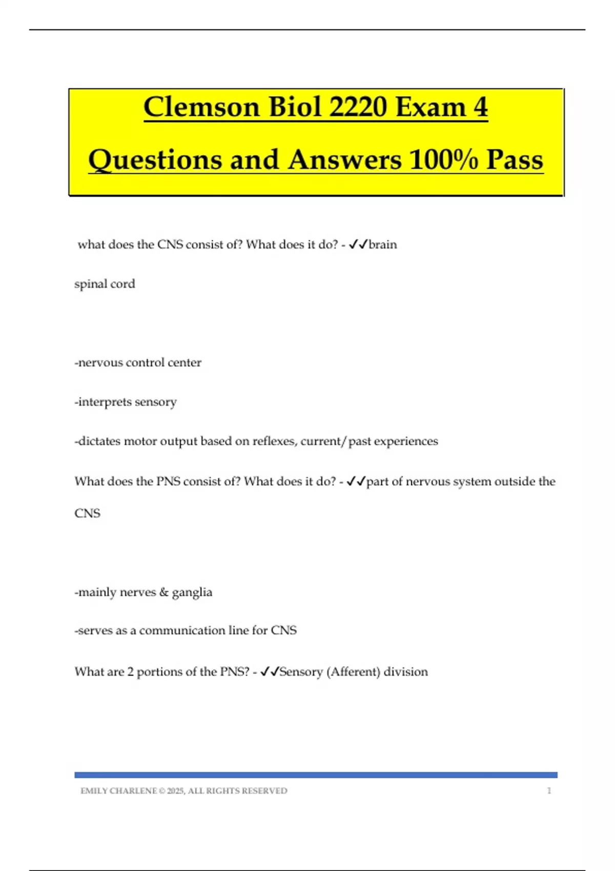 Clemson Biol 2220 Exam 4 Questions and Answers 100% Pass what does the CNS consist of? What does it do? - brain spinal cord -nervous control center -interprets sensory -dictates motor output based on reflexes, current/past experiences What does the PNS consist of? What does it do? - part of nervous system outside the CNS -mainly nerves & ganglia -serves as a communication line for CNS What are 2 portions of the PNS? - Sensory (Afferent) division EMILY CHARLENE © 2025, ALL RIGHTS RESERVED 2 Motor (Efferent) division What does the Sensory (Afferent) division of the PNS do? What nerve fiber(s) does it contain? - -somatic & visceral nerve fibers -conduct impulse from receptors to the CNS What does the Motor (Efferent) division of the PNS do? What nerve fiber(s) does it contain? - -motor nerve fibers -conduct impulses from CNS to effectors (the muscles and glands) What are 2 systems of the Motor (Efferent) division of the PNS? - Somatic nervous system